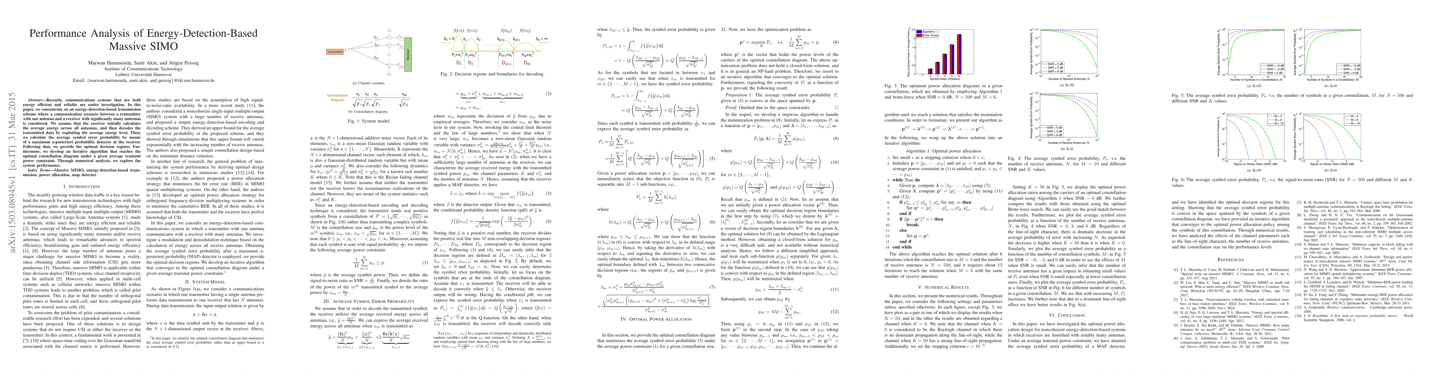 Recently, communications systems that are both energy efficient and reliable are under investigation. In this paper, we concentrate on an energy-detection-based transmission scheme where a communication scenario between a transmitter with one antenna and a receiver with significantly many antennas is considered. We assume that the receiver initially calculates the average energy across all antennas, and then decodes the transmitted data by exploiting the average energy level. Then, we calculate the average symbol error probability by means of a maximum a-posteriori probability detector at the receiver. Following that, we provide the optimal decision regions. Furthermore, we develop an iterative algorithm that reaches the optimal constellation diagram under a given average transmit power constraint. Through numerical analysis, we explore the system performance.