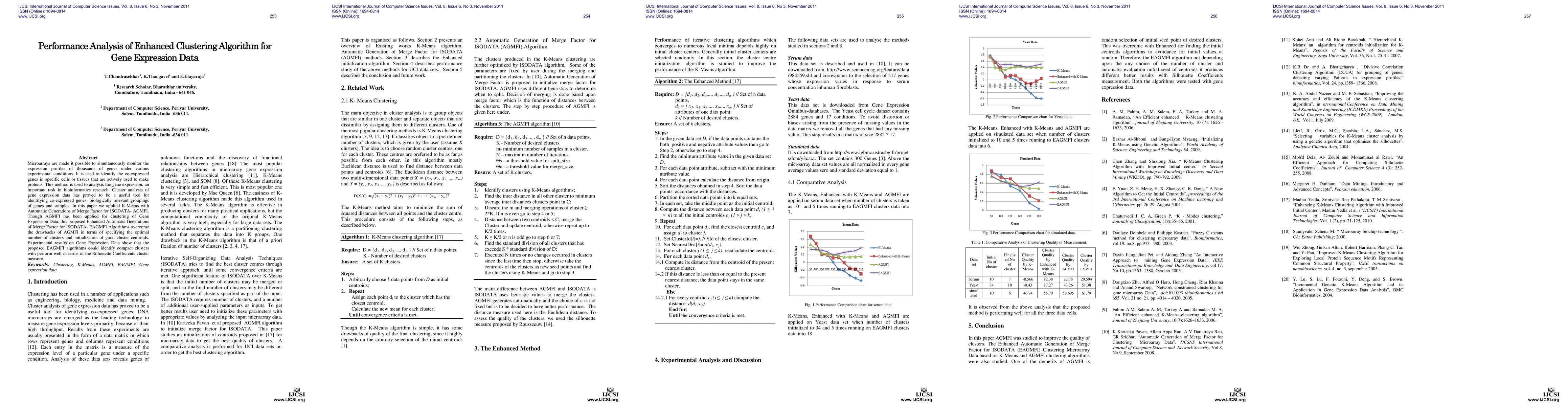 This paper proposes an Enhanced Automatic Generations of Merge Factor for ISODATA (EAGMFI) algorithm to improve the clustering of gene expression data, addressing the limitations of its predecessor, Automatic Generations of Merge Factor for ISODATA (AGMFI). Experimental results show that EAGMFI outperforms AGMFI in identifying optimal clusters, as evidenced by higher Silhouette Coefficients.