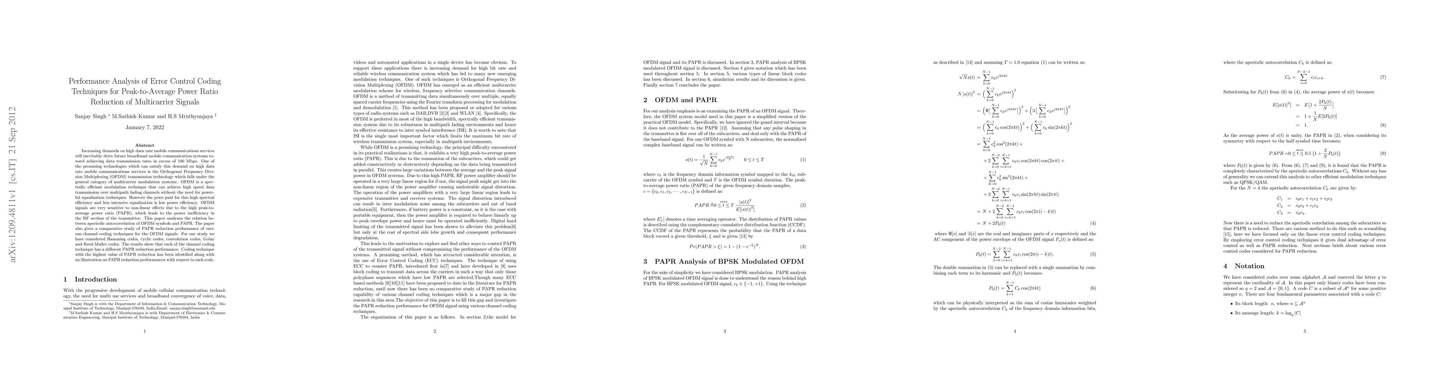 This paper analyzes the impact of various error control coding techniques on the peak-to-average power ratio (PAPR) reduction for Orthogonal Frequency Division Multiplexing (OFDM) signals. It identifies the PAPR reduction performance of Hamming, cyclic, convolution, Golay, and Reed-Muller codes, revealing that each coding technique has distinct PAPR reduction capabilities.
