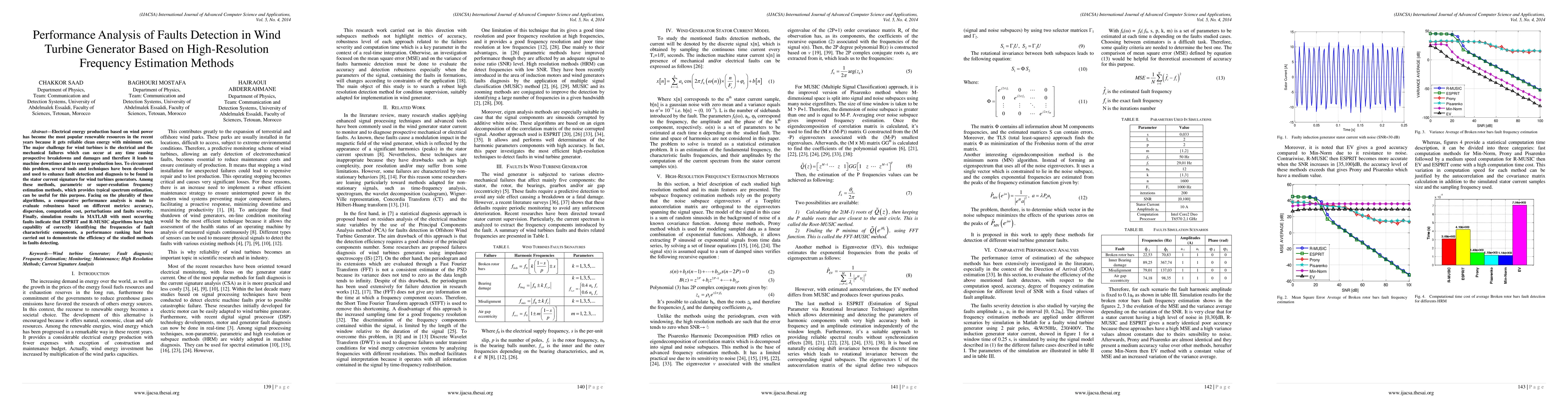 This paper analyzes fault detection in wind turbine generators using high-resolution frequency estimation methods, finding that ESPRIT and R-MUSIC algorithms perform well in identifying frequencies of fault characteristic components.