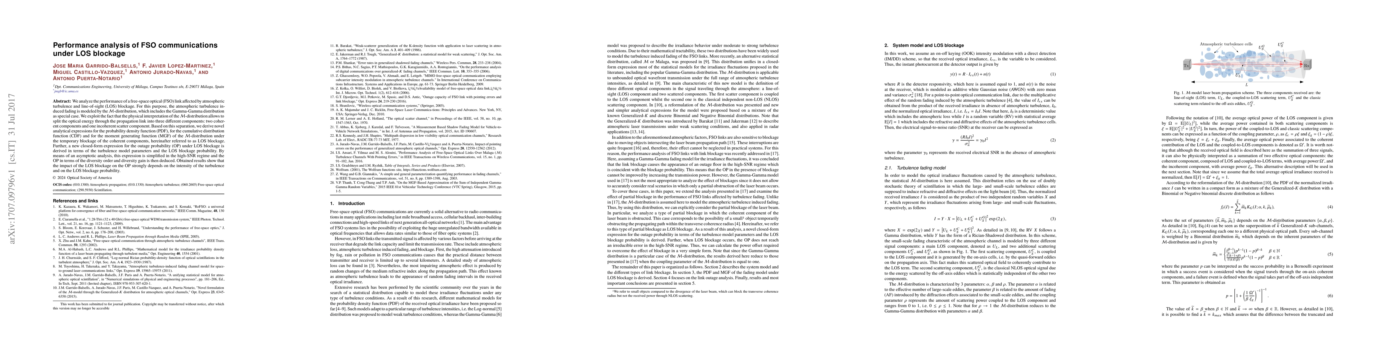 Researchers analyzed FSO communication performance under LOS blockage, deriving new expressions for probability density function, outage probability, and diversity gain in terms of turbulence model parameters and blockage probabilities.