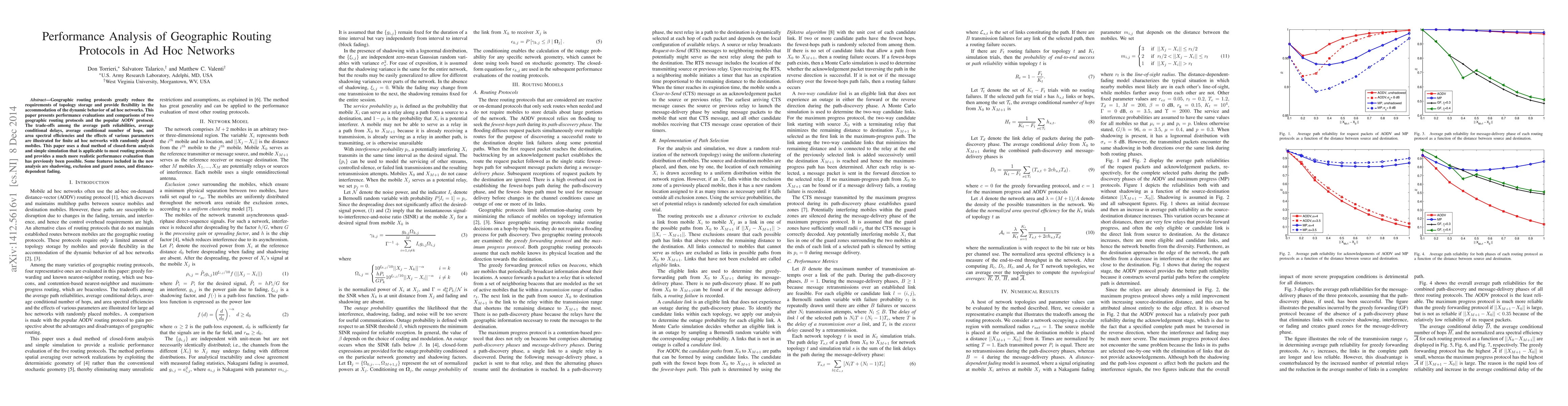 This paper evaluates and compares the performance of two geographic routing protocols against the AODV protocol in ad hoc networks, focusing on path reliability, delay, hop count, and area efficiency. The study employs both closed-form analysis and simulation, incorporating factors like shadowing and fading for a realistic assessment.