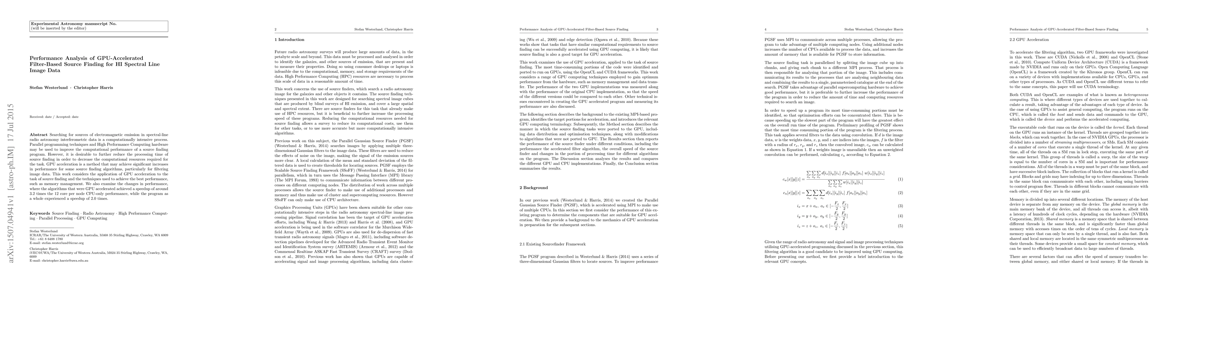 This paper analyzes GPU-accelerated filter-based source finding for HI spectral line image data, achieving a 3.2x speedup for specific algorithms and a 2.0x overall speedup compared to CPU-only performance, highlighting the benefits of GPU acceleration in reducing computational resources.