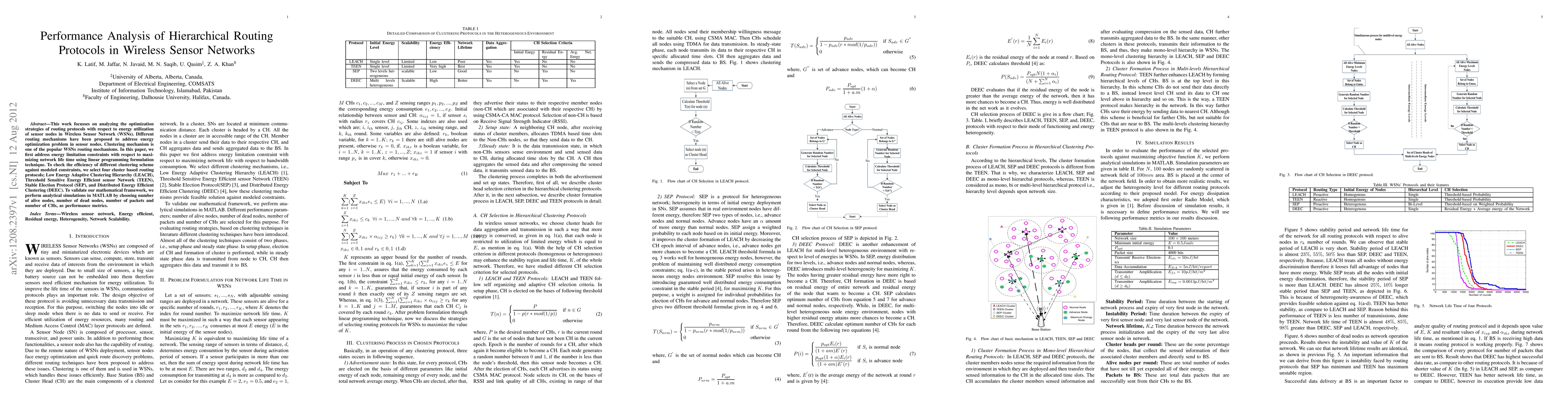 This paper analyzes the energy optimization strategies of hierarchical routing protocols in Wireless Sensor Networks (WSNs) using linear programming to maximize network lifetime. It evaluates four clustering-based protocols—LEACH, TEEN, SEP, and DEEC—through analytical simulations in MATLAB.