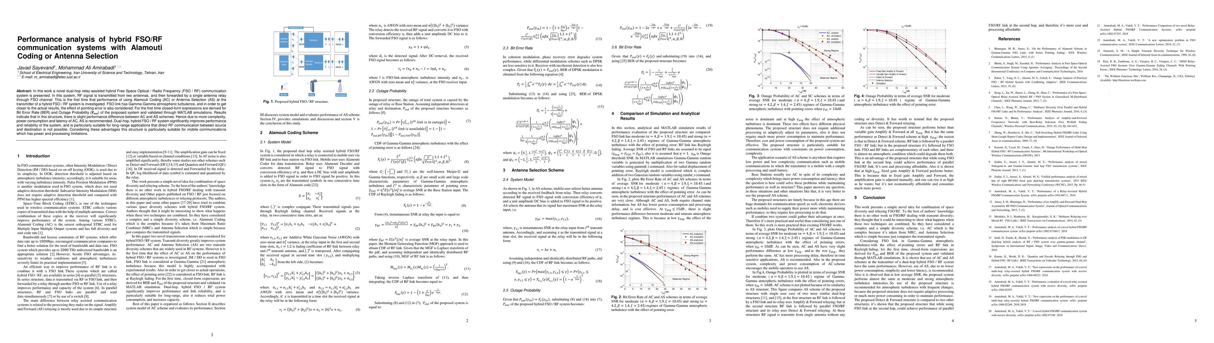 This paper investigates a dual-hop relay-assisted hybrid FSO/RF communication system, deriving closed-form expressions for BER and Outage Probability. It finds that Antenna Selection offers better performance than Alamouti Coding due to lower complexity, power consumption, and latency, making it suitable for long-range and mobile communications.