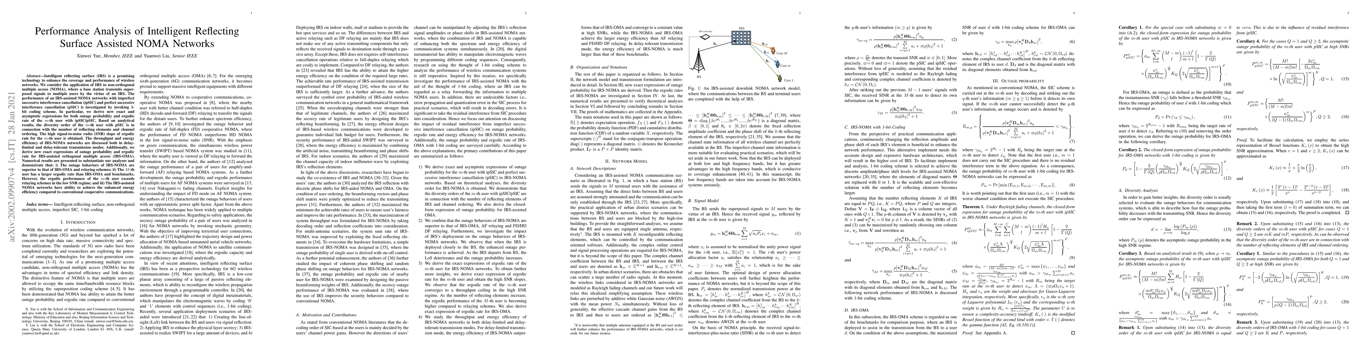 This paper analyzes the performance of intelligent reflecting surface (IRS) assisted non-orthogonal multiple access (NOMA) networks, deriving exact and asymptotic expressions for outage probability and ergodic rate under imperfect and perfect successive interference cancellation. Numerical results show that IRS-NOMA outperforms IRS-OMA and relaying schemes, especially with more reflecting elements, while achieving better throughput and energy efficiency.