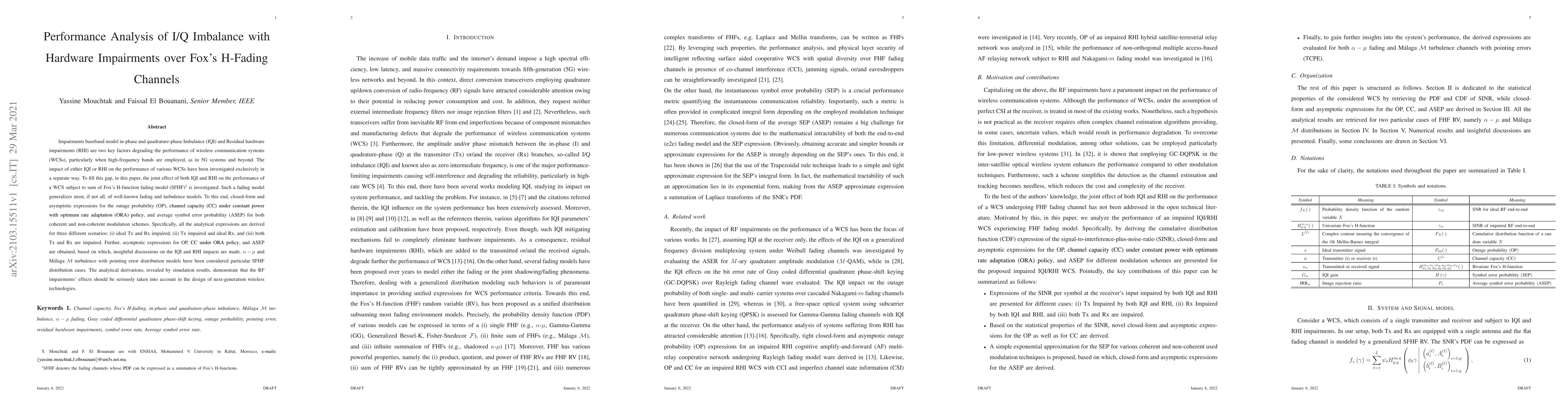 Impairments baseband model in-phase and quadrature-phase Imbalance (IQI) and Residual hardware impairments (RHI) are two key factors degrading the performance of wireless communication systems (WCSs), particularly when high-frequency bands are employed, as in 5G systems and beyond. The impact of either IQI or RHI on the performance of various WCSs has been investigated exclusively in a separate way. To fill this gap, in this paper, the joint effect of both IQI and RHI on the performance of a WCS subject to the sum of Fox's H-function fading model (SFHF) is investigated. Such a fading model generalizes most, if not all, of well-known fading and turbulence models. To this end, closed-form and asymptotic expressions for the outage probability (OP), channel capacity (CC) under constant power with optimum rate adaptation (ORA) policy, and average symbol error probability (ASEP) for both coherent and non-coherent modulation schemes. Specifically, all the analytical expressions are derived for three different scenarios: (i) ideal Tx and Rx impaired, (ii) Tx impaired and ideal Rx, and (iii) both Tx and Rx are impaired. Further, asymptotic expressions for OP, CC under ORA policy, and ASEP are obtained, based on which, insightful discussions on the IQI and RHI impacts are made. Alpha-mu and Malaga M turbulence with pointing error distribution models have been considered particular SFHF distribution cases. The analytical derivations, revealed by simulation results, demonstrate that the RF impairments' effects should be seriously taken into account in the design of next-generation wireless technologies.