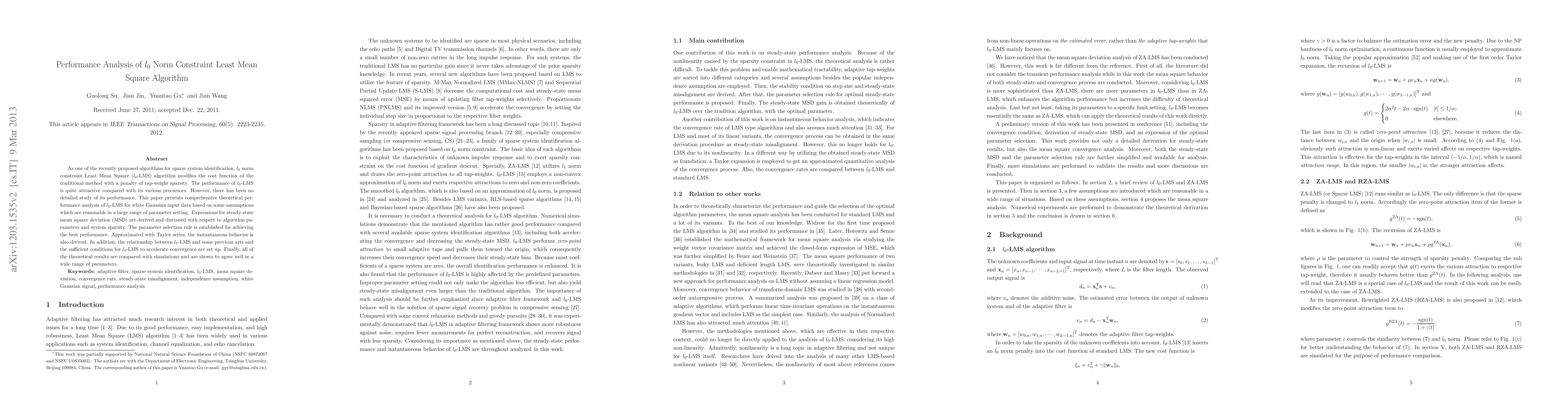 This paper conducts a comprehensive theoretical analysis of the $l_0$ norm constraint Least Mean Square (LMS) algorithm for sparse system identification, deriving expressions for steady-state mean square deviation and establishing parameter selection rules for optimal performance. Simulation results confirm the theoretical findings.
