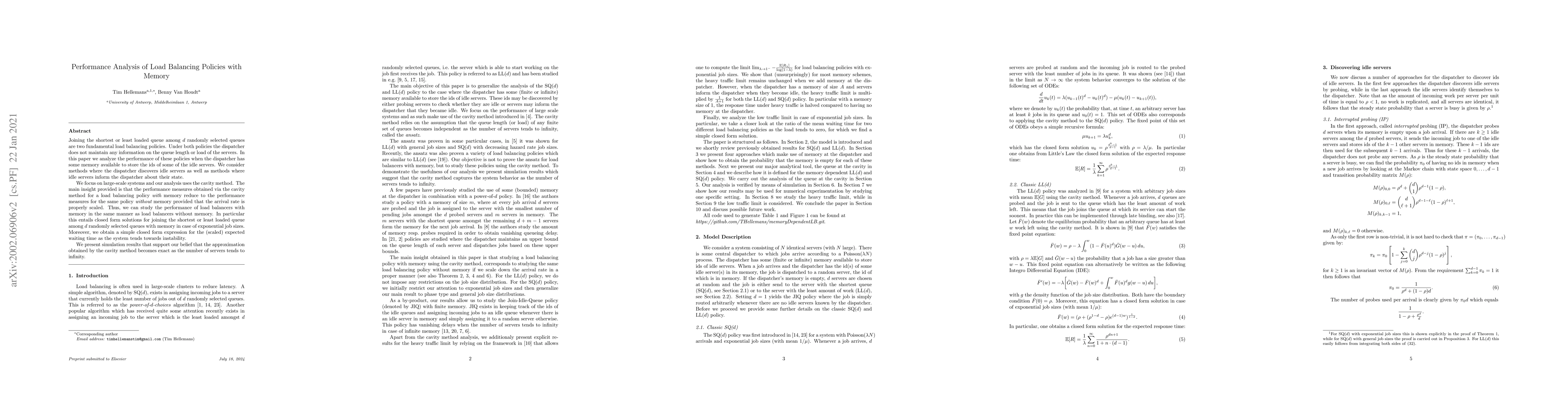 This paper analyzes load balancing policies that utilize memory to track idle servers, comparing them to traditional memoryless methods. The study reveals that performance measures for load balancing with memory converge to those without memory when arrival rates are appropriately scaled, allowing for a unified analysis and closed-form solutions for large-scale systems.
