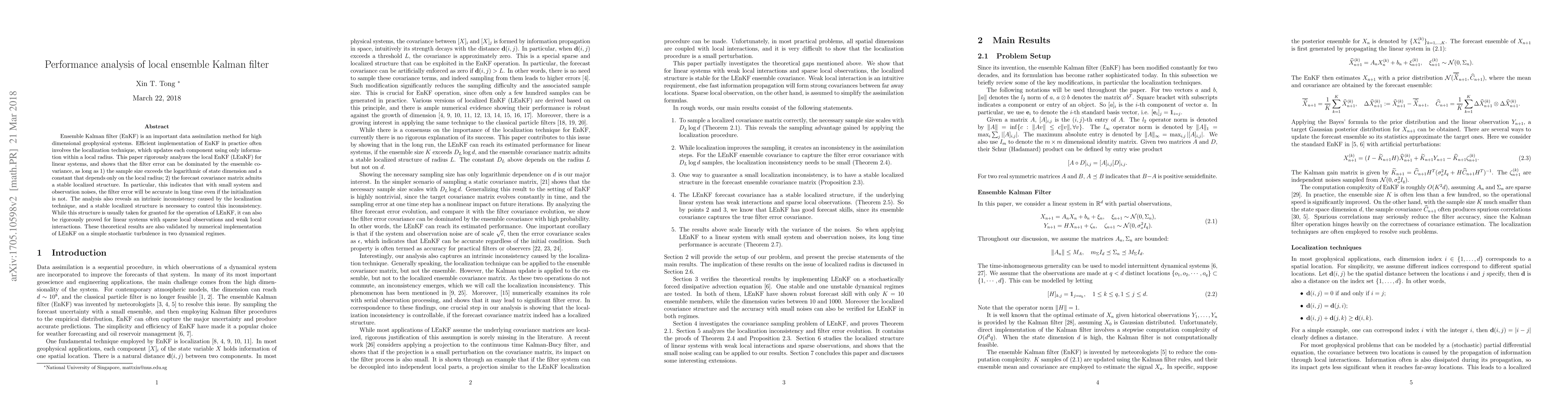 This paper rigorously analyzes the performance of the local ensemble Kalman filter (LEnKF) for linear systems, demonstrating that filter accuracy depends on ensemble covariance and a stable localized structure. Numerical results validate the theoretical findings for stochastic turbulence.