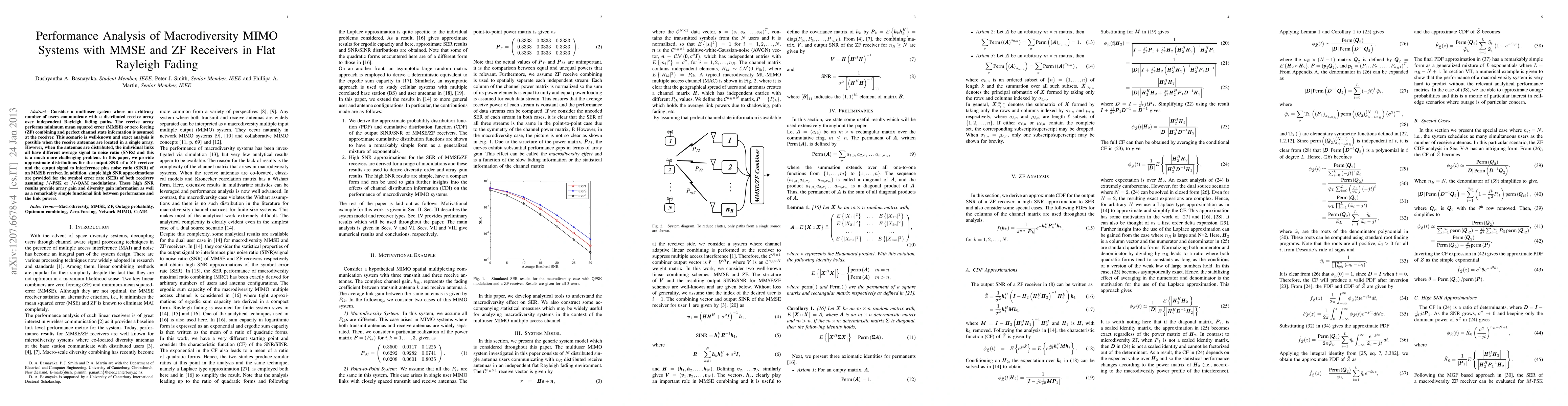 This paper analyzes macrodiversity MIMO systems with MMSE and ZF receivers under Rayleigh fading, focusing on distributed receive arrays. It provides approximate distributions for output SNR and SINR, along with high SNR approximations for symbol error rates, offering insights into array and diversity gains.