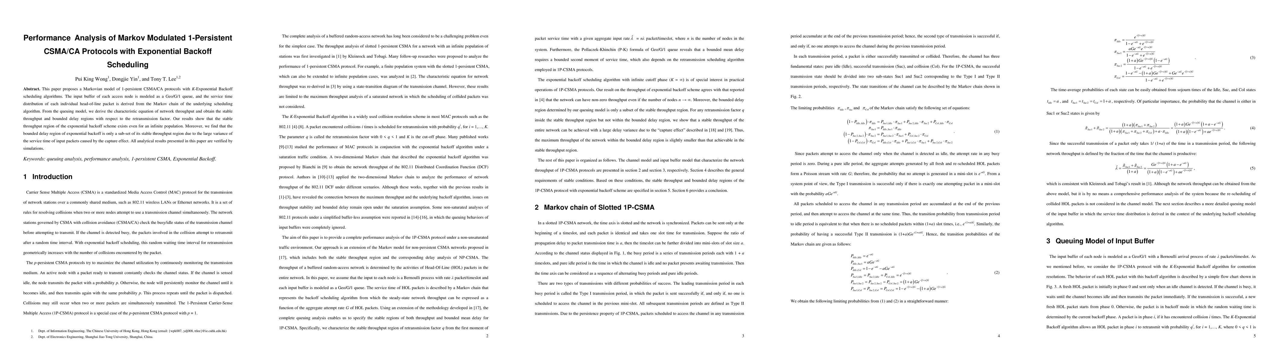 This paper proposes a Markovian model of 1-persistent CSMA/CA protocols with K-Exponential Backoff scheduling algorithms. The input buffer of each access node is modeled as a Geo/G/1 queue, and the service time distribution of each individual head-of-line packet is derived from the Markov chain of the underlying scheduling algorithm. From the queuing model, we derive the characteristic equation of network throughput and obtain the stable throughput and bounded delay regions with respect to the retransmission factor. Our results show that the stable throughput region of the exponential backoff scheme exists even for an infinite population. Moreover, we find that the bounded delay region of exponential backoff is only a sub-set of its stable throughput region due to the large variance of the service time of input packets caused by the capture effect. All analytical results presented in this paper are verified by simulations.
