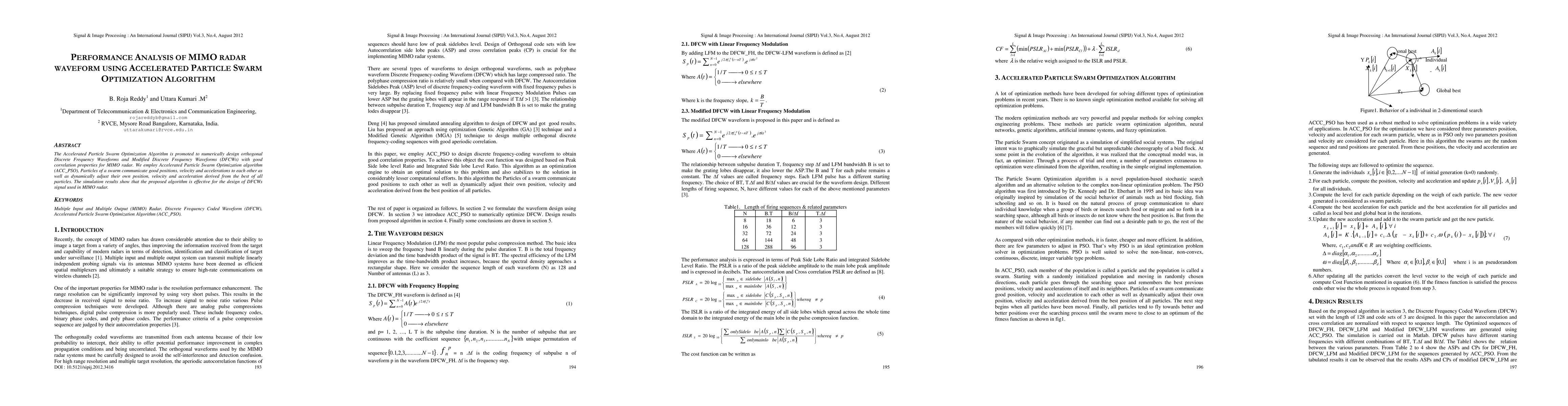 This paper proposes using the Accelerated Particle Swarm Optimization Algorithm to design orthogonal Discrete Frequency Waveforms for MIMO radar with good correlation properties. The ACC_PSO algorithm dynamically adjusts particles' positions and velocities based on the best-found positions, demonstrating effective performance in simulations for MIMO radar signal design.