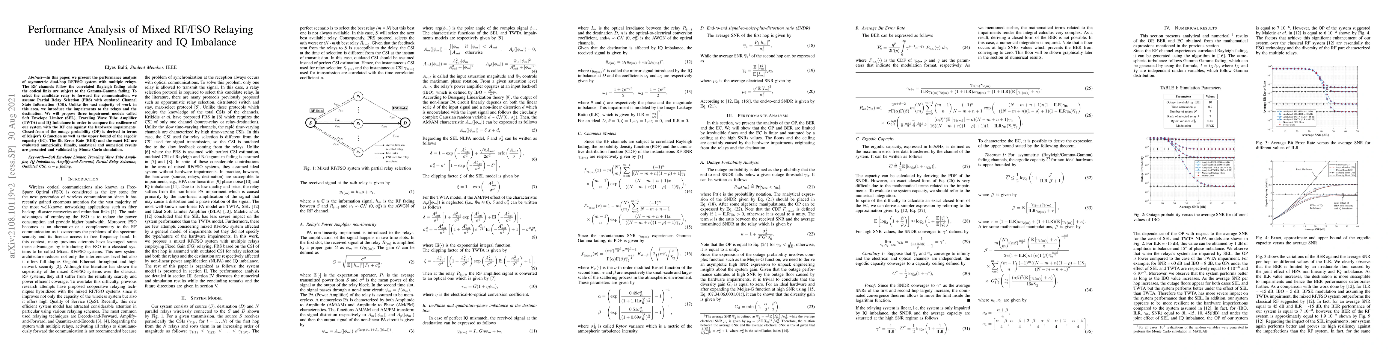 This paper analyzes the performance of an asymmetric dual-hop RF/FSO relaying system under hardware impairments, including HPA nonlinearity and IQ imbalance. It derives closed-form outage probability and upper bound of ergodic capacity, evaluates BER, and validates results via Monte Carlo simulation.