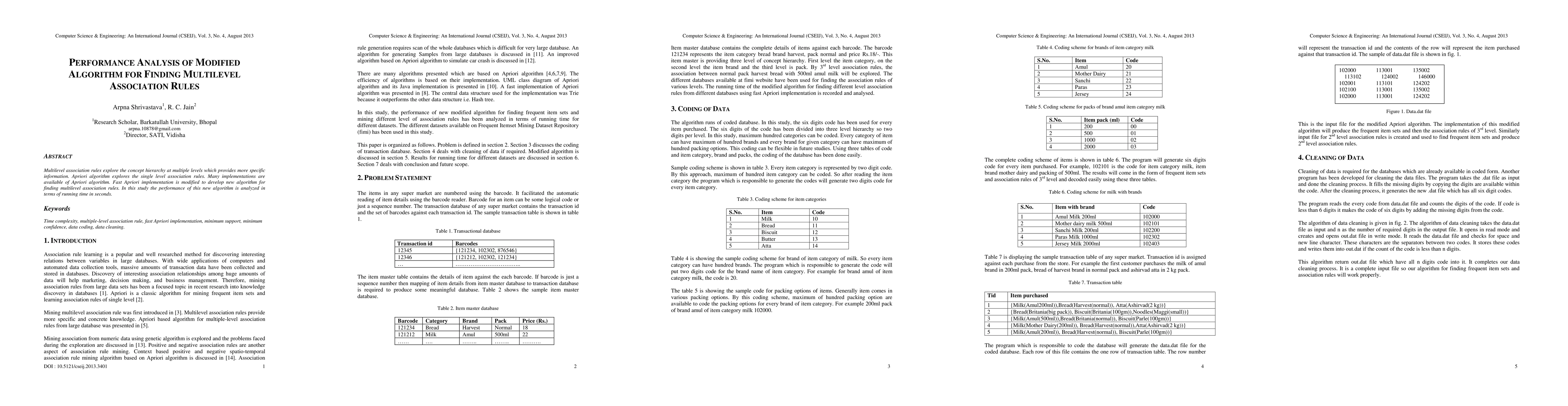 This paper presents a modified version of the Fast Apriori algorithm designed to find multilevel association rules, and analyzes its performance in terms of running time compared to traditional Apriori implementations. The study concludes with insights into the efficiency of the new algorithm for hierarchical data analysis.