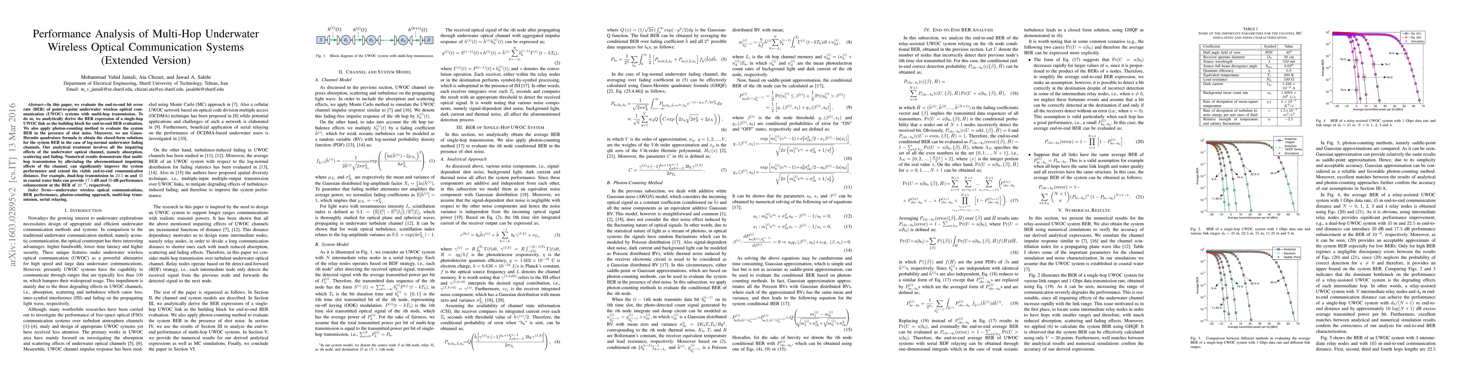 This paper analyzes the end-to-end bit error rate (BER) of multi-hop underwater wireless optical communication systems, deriving analytical expressions for single-hop BER and applying photon-counting and Gauss-Hermite quadrature methods to account for shot noise and log-normal fading. Numerical results show significant performance improvements and extended communication distances through multi-hop transmission.