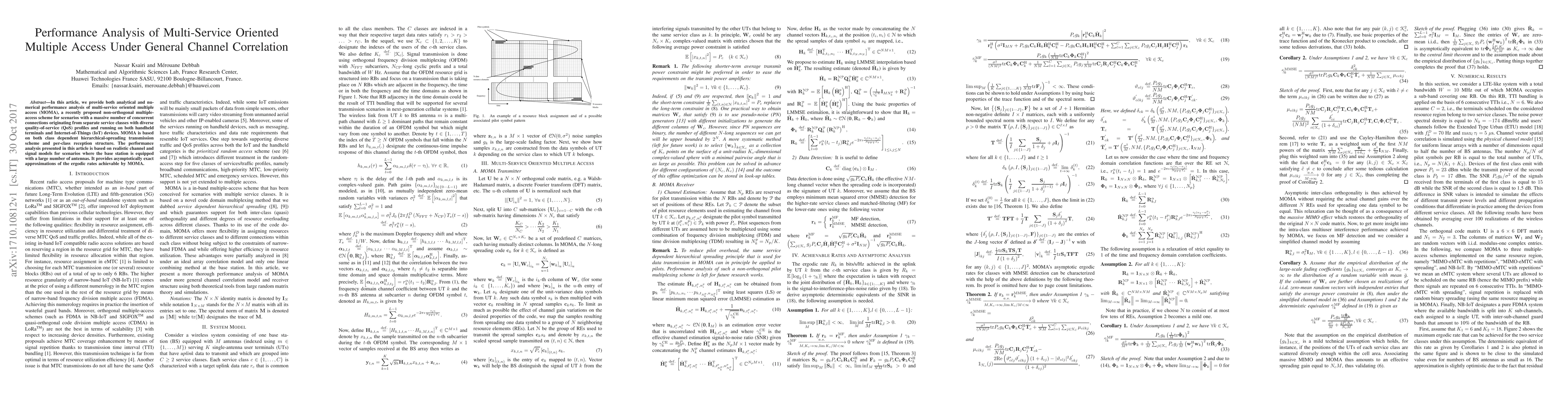 In this article, we provide both analytical and numerical performance analysis of multi-service oriented multiple access (MOMA), a recently proposed non-orthogonal multiple-access scheme for scenarios with a massive number of concurrent connections originating from separate service classes with diverse quality-of-service (QoS) profiles and running on both handheld terminals and Internet-of-Things (IoT) devices. MOMA is based on both class dependent hierarchical-spreading transmission scheme and per-class reception structure. The performance analysis presented in this article is based on realistic channel and signal models for scenarios where the base station is equipped with a large number of antennas. It provides asymptotically exact approximations of the ergodic rates achievable by MOMA.