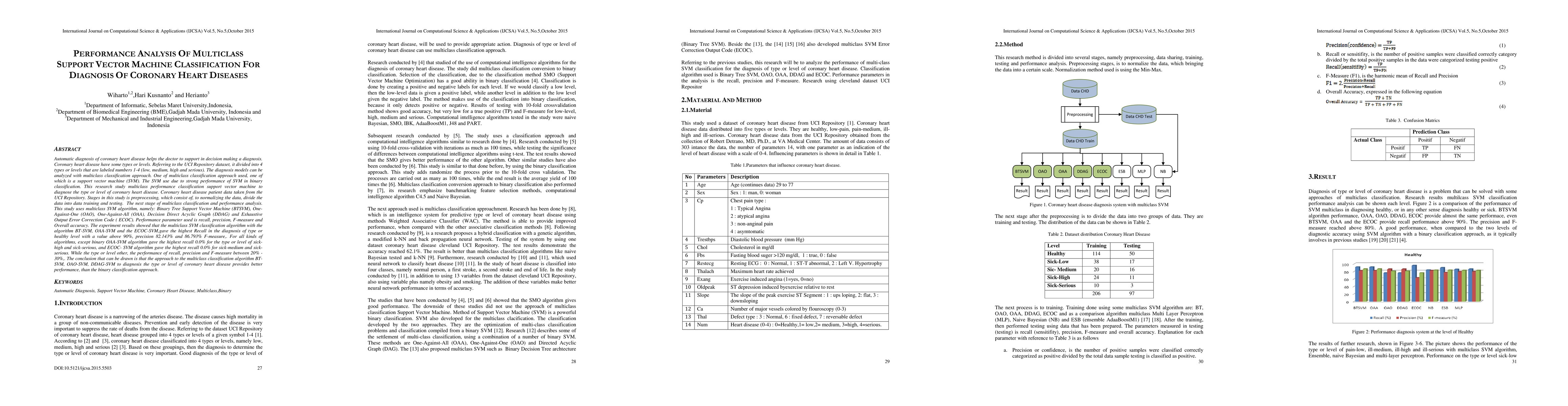 This study analyzes the performance of various multiclass SVM classification algorithms—BTSVM, OAO, OAA, DDAG, and ECOC—to diagnose different levels of coronary heart disease using patient data from the UCI Repository. Performance metrics include recall, precision, F-measure, and overall accuracy.