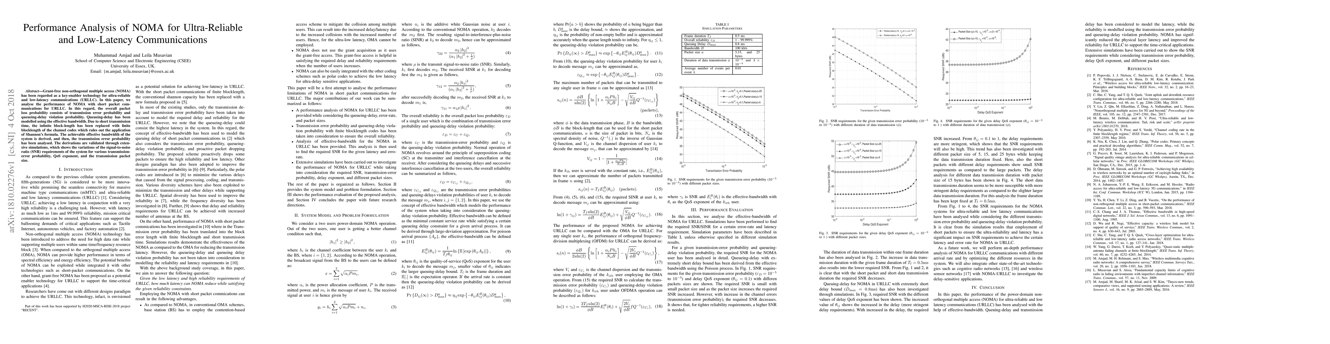This paper analyzes the performance of grant-free non-orthogonal multiple access (NOMA) for ultra-reliable and low-latency communications (URLLC), focusing on short packet communications. It derives the achievable effective bandwidth and analyzes the transmission error probability, validated by simulations showing SNR requirements under various conditions.