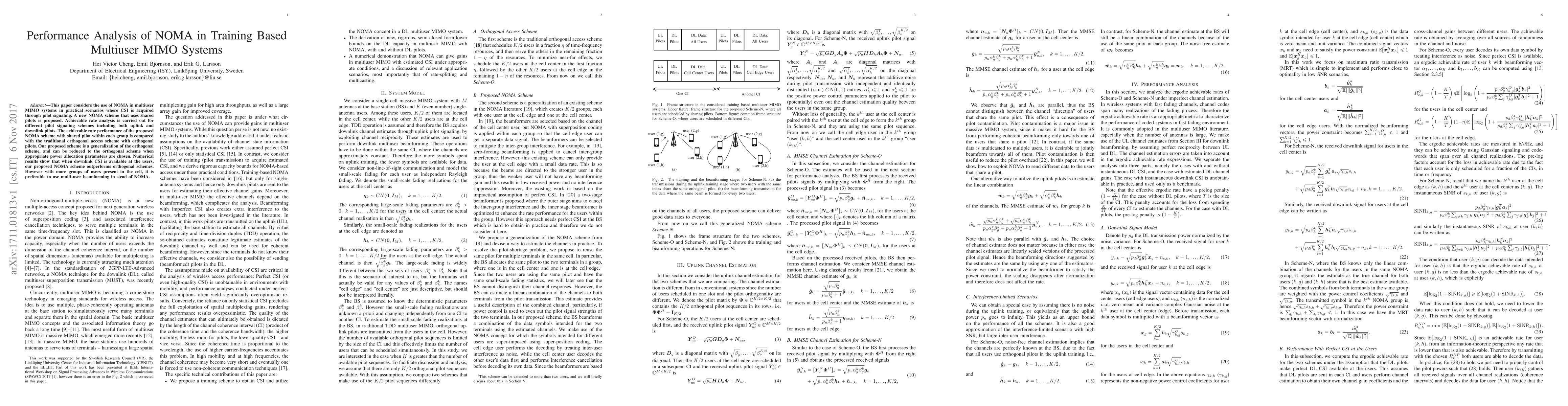 This paper proposes a novel NOMA scheme using shared pilots in multiuser MIMO systems, analyzing achievable rates for different pilot signaling methods. The proposed scheme outperforms traditional orthogonal access when downlink CSI is available, but multi-user beamforming is preferable with many user groups.