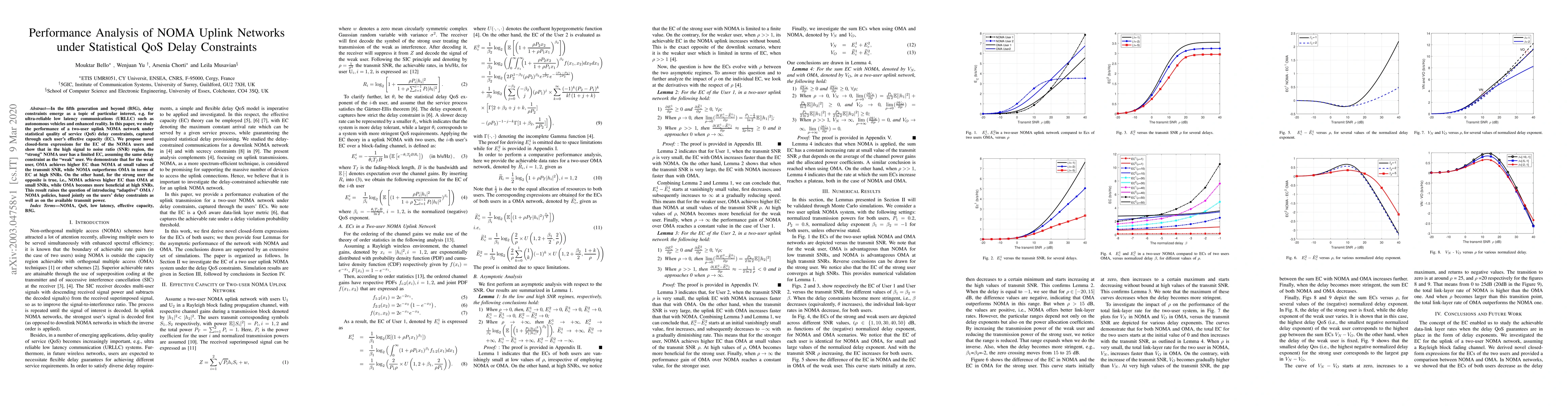 In the fifth generation and beyond (B5G), delayconstraints emerge as a topic of particular interest, e.g. forultra-reliable low latency communications (URLLC) such asautonomous vehicles and enhanced reality. In this paper, westudythe performance of a two-user uplink NOMA network understatistical quality of service (QoS) delay constraints, capturedthrough each user s effective capacity (EC). We propose novelclosed-form expressions for the EC of the NOMA users andshow that in the high signal to noise ratio (SNR) region, the 'strong' NOMA user has a limited EC, assuming the same delayconstraint as the 'weak' user. We demonstrate that for the weakuser, OMA achieves higher EC than NOMA at small values ofthe transmit SNR, while NOMA outperforms OMA in terms ofEC at high SNRs. On the other hand, for the strong user theopposite is true, i.e., NOMA achieves higher EC than OMA atsmall SNRs, while OMA becomes more beneficial at high SNRs.This result raises the question of introducing 'adaptive' OMA /NOMA policies, based jointly on the users delay constraints aswell as on the available transmit power.