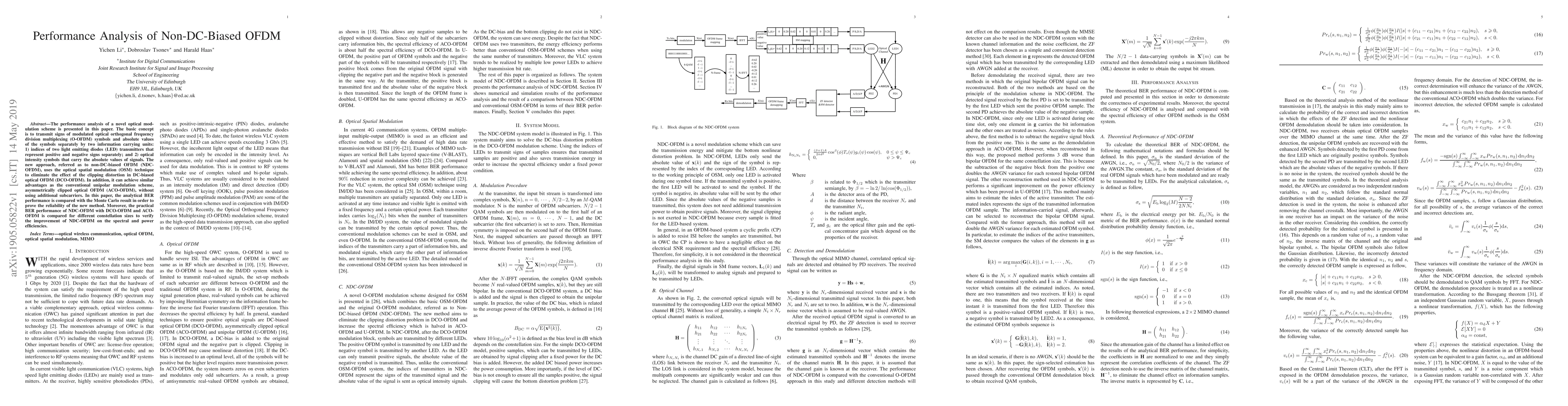 This paper analyzes a novel non-DC-biased OFDM (NDC-OFDM) scheme that transmits modulated O-OFDM symbols using separate LED indices for signs and optical intensity for absolute values, achieving improved spectral and power efficiencies compared to DC-biased and asymmetrically clipped OFDM. Analytical and Monte Carlo results confirm the method's reliability and performance benefits.
