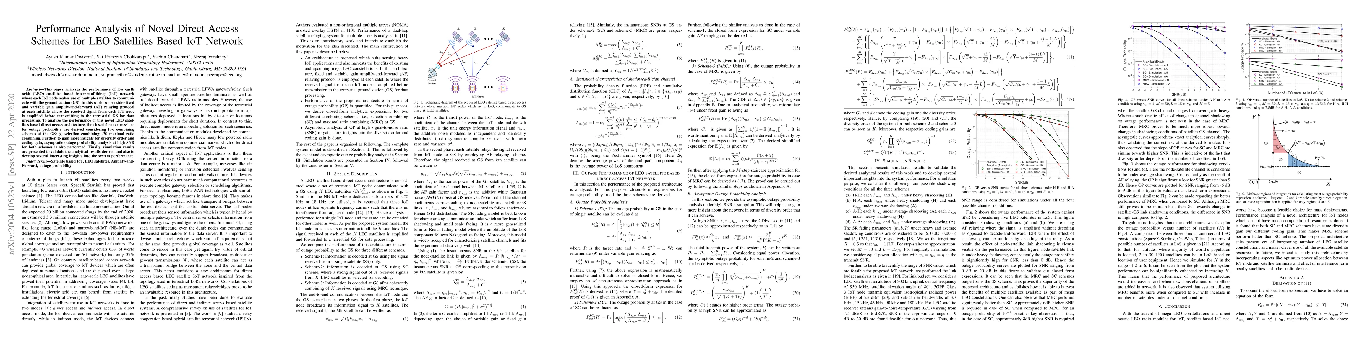 This paper evaluates the performance of a novel direct access scheme for LEO satellites in IoT networks, employing fixed and variable gain AF relaying protocols. Analytical models for outage probability under selection and maximal ratio combining at the ground station are developed, and simulation results validate these models and provide insights into diversity order and coding gain.
