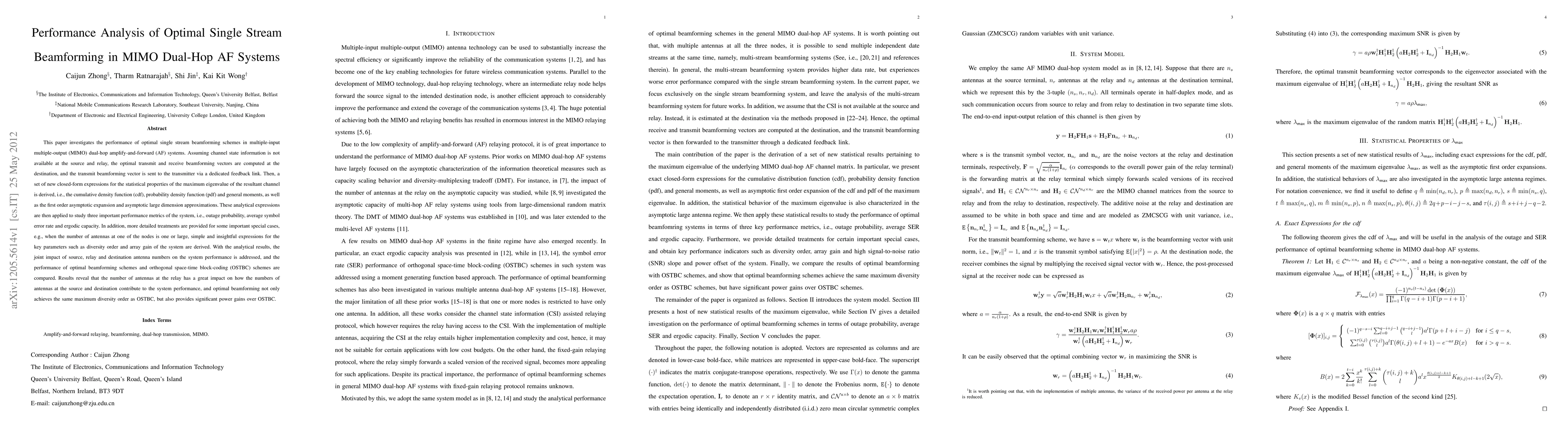 This paper investigates the performance of optimal single stream beamforming schemes in multiple-input multiple-output (MIMO) dual-hop amplify-and-forward (AF) systems. Assuming channel state information is not available at the source and relay, the optimal transmit and receive beamforming vectors are computed at the destination, and the transmit beamforming vector is sent to the transmitter via a dedicated feedback link. Then, a set of new closed-form expressions for the statistical properties of the maximum eigenvalue of the resultant channel is derived, i.e., the cumulative density function (cdf), probability density function (pdf) and general moments, as well as the first order asymptotic expansion and asymptotic large dimension approximations. These analytical expressions are then applied to study three important performance metrics of the system, i.e., outage probability, average symbol error rate and ergodic capacity. In addition, more detailed treatments are provided for some important special cases, e.g., when the number of antennas at one of the nodes is one or large, simple and insightful expressions for the key parameters such as diversity order and array gain of the system are derived. With the analytical results, the joint impact of source, relay and destination antenna numbers on the system performance is addressed, and the performance of optimal beamforming schemes and orthogonal space-time block-coding (OSTBC) schemes are compared. Results reveal that the number of antennas at the relay has a great impact on how the numbers of antennas at the source and destination contribute to the system performance, and optimal beamforming not only achieves the same maximum diversity order as OSTBC, but also provides significant power gains over OSTBC.