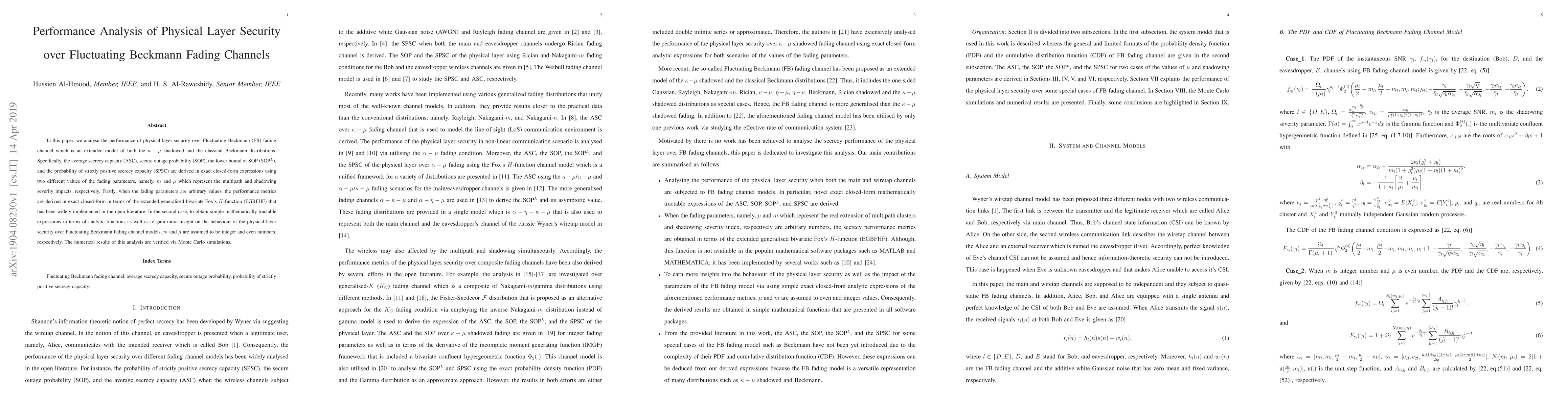 In this paper, we analyse the performance of physical layer security over Fluctuating Beckmann (FB) fading channel which is an extended model of both the $\kappa-\mu$ shadowed and the classical Beckmann distributions. Specifically, the average secrecy capacity (ASC), secure outage probability (SOP), the lower bound of SOP (SOP$^L$), and the probability of strictly positive secrecy capacity (SPSC) are derived in exact closed-form expressions using two different values of the fading parameters, namely, $m$ and $\mu$ which represent the multipath and shadowing severity impacts, respectively. Firstly, when the fading parameters are arbitrary values, the performance metrics are derived in exact closed-form in terms of the extended generalised bivariate Fox's $H$-function (EGBFHF) that has been widely implemented in the open literature. In the second case, to obtain simple mathematically tractable expressions in terms of analytic functions as well as to gain more insight on the behaviour of the physical layer security over Fluctuating Beckmann fading channel models, $m$ and $\mu$ are assumed to be integer and even numbers, respectively. The numerical results of this analysis are verified via Monte Carlo simulations.