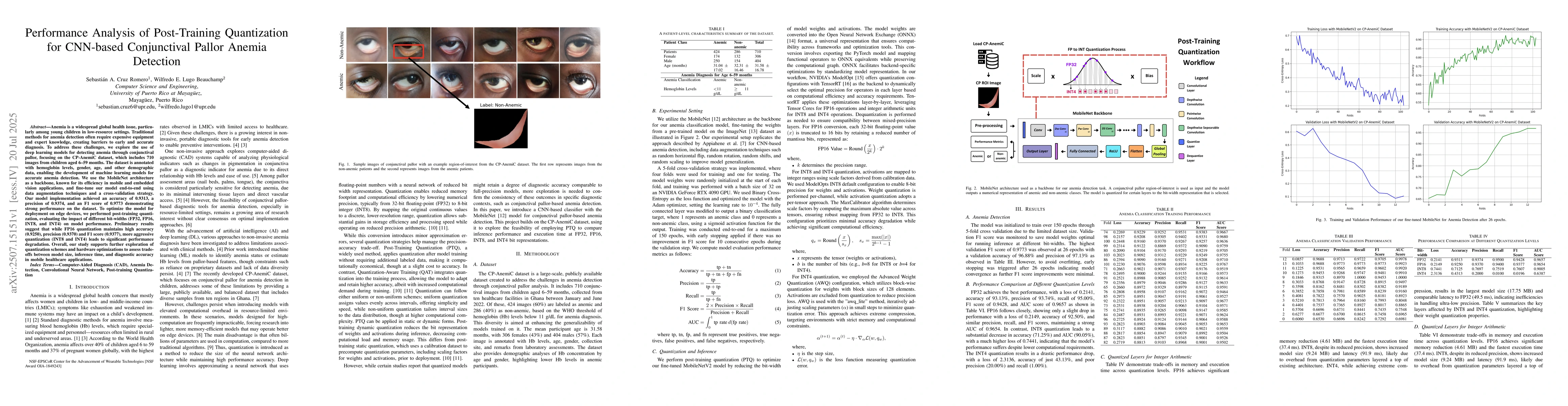 Anemia is a widespread global health issue, particularly among young children in low-resource settings. Traditional methods for anemia detection often require expensive equipment and expert knowledge, creating barriers to early and accurate diagnosis. To address these challenges, we explore the use of deep learning models for detecting anemia through conjunctival pallor, focusing on the CP-AnemiC dataset, which includes 710 images from children aged 6-59 months. The dataset is annotated with hemoglobin levels, gender, age and other demographic data, enabling the development of machine learning models for accurate anemia detection. We use the MobileNet architecture as a backbone, known for its efficiency in mobile and embedded vision applications, and fine-tune our model end-to-end using data augmentation techniques and a cross-validation strategy. Our model implementation achieved an accuracy of 0.9313, a precision of 0.9374, and an F1 score of 0.9773 demonstrating strong performance on the dataset. To optimize the model for deployment on edge devices, we performed post-training quantization, evaluating the impact of different bit-widths (FP32, FP16, INT8, and INT4) on model performance. Preliminary results suggest that while FP16 quantization maintains high accuracy (0.9250), precision (0.9370), and F1 Score (0.9377), more aggressive quantization (INT8 and INT4) leads to significant performance degradation. Overall, our study supports further exploration of quantization schemes and hardware optimizations to assess trade-offs between model size, inference time, and diagnostic accuracy in mobile healthcare applications.