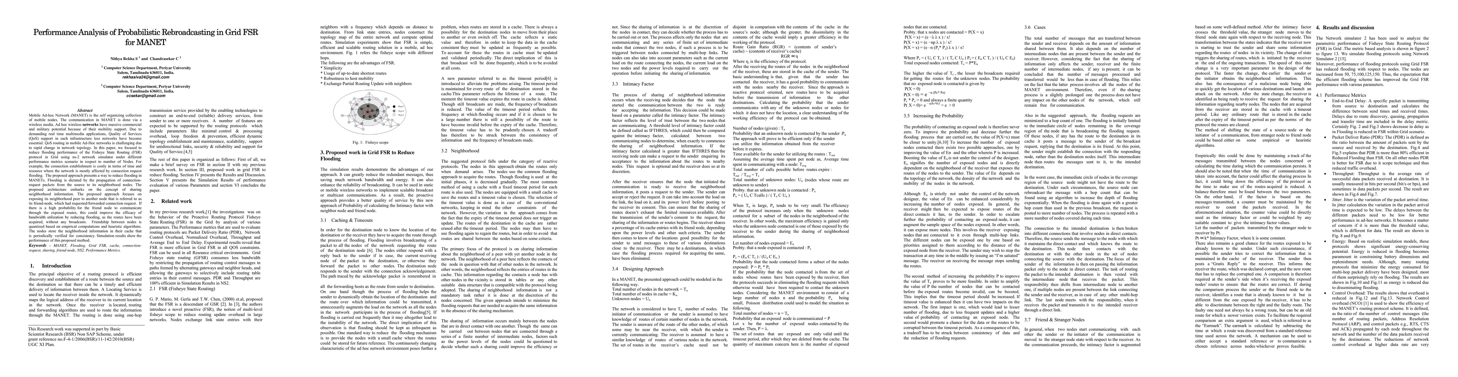 Mobile Ad-hoc Network (MANET) is the self organizing collection of mobile nodes. The communication in MANET is done via a wireless media. Ad hoc wireless networks have massive commercial and military potential because of their mobility support. Due to demanding real time multimedia applications, Quality of Services (QoS) support in such infrastructure less networks have become essential. QoS routing in mobile Ad-Hoc networks is challenging due to rapid change in network topology. In this paper, we focused to reduce flooding performance of the Fisheye State Routing (FSR) protocol in Grid using ns-2 network simulator under different performance metrics scenario in respect to number of Nodes. For example, the connection establishment is costly in terms of time and resource where the network is mostly affected by connection request flooding. The proposed approach presents a way to reduce flooding in MANETs. Flooding is dictated by the propagation of connection-request packets from the source to its neighborhood nodes. The proposed architecture embarks on the concept of sharing neighborhood information. The proposed approach focuses on exposing its neighborhood peer to another node that is referred to as its friend-node, which had requested/forwarded connection request. If there is a high probability for the friend node to communicate through the exposed routes, this could improve the efficacy of bandwidth utilization by reducing flooding, as the routes have been acquired, without any broadcasts. Friendship between nodes is quantized based on empirical computations and heuristic algorithms. The nodes store the neighborhood information in their cache that is periodically verified for consistency. Simulation results show the performance of this proposed method.