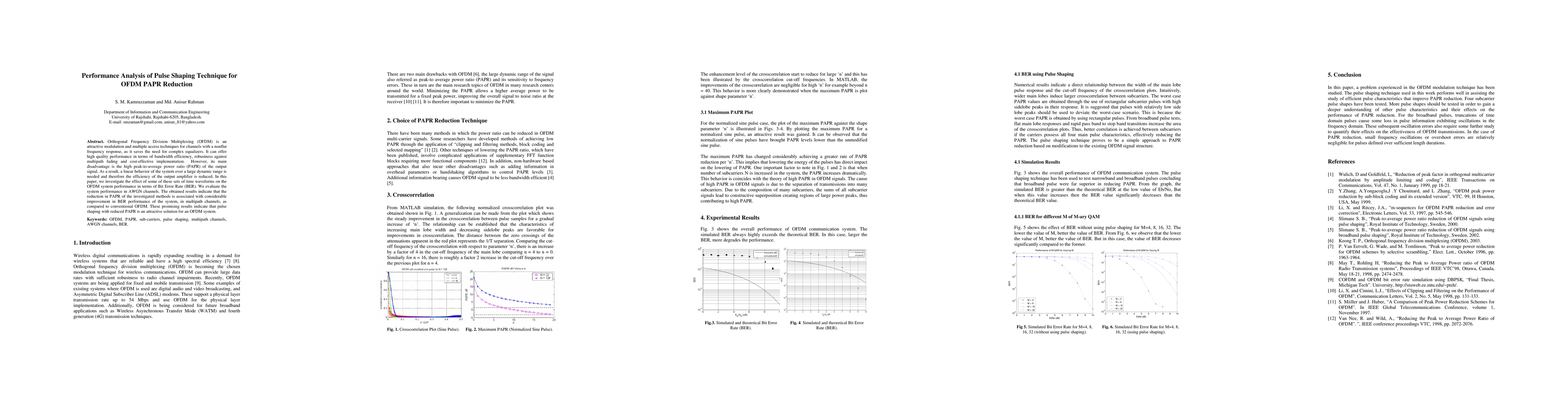 This paper analyzes the performance of pulse shaping techniques for reducing the peak-to-average power ratio (PAPR) in OFDM systems, showing that these methods significantly improve Bit Error Rate (BER) performance in both AWGN and multipath channels compared to conventional OFDM.