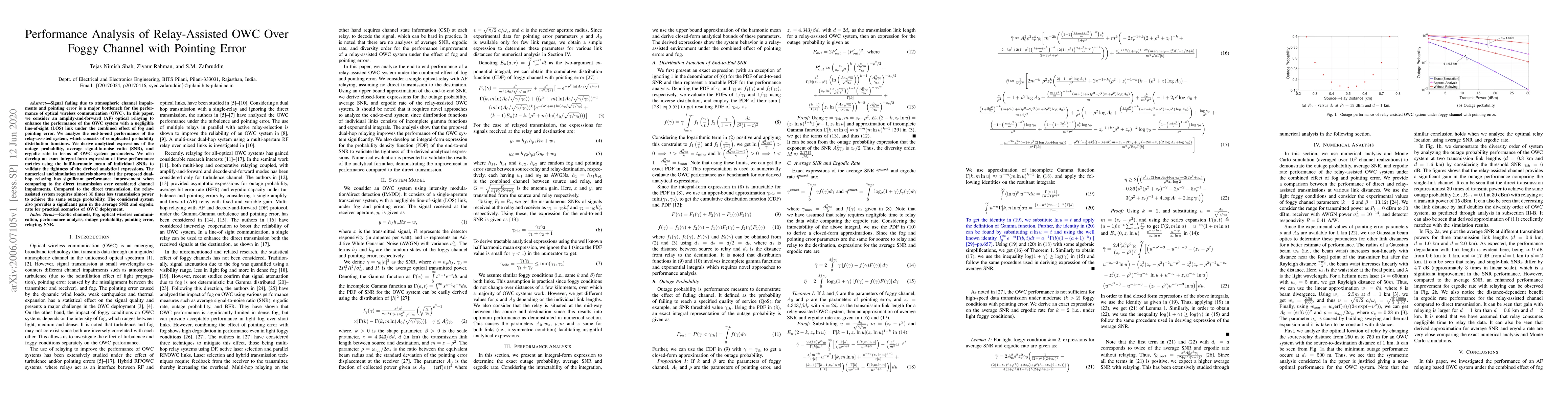 This paper analyzes the performance of relay-assisted optical wireless communication (OWC) under fog and pointing error, deriving analytical expressions for outage probability, average SNR, and ergodic rate. The results show significant performance improvement and reduced power requirements for relay-assisted systems compared to direct transmission.