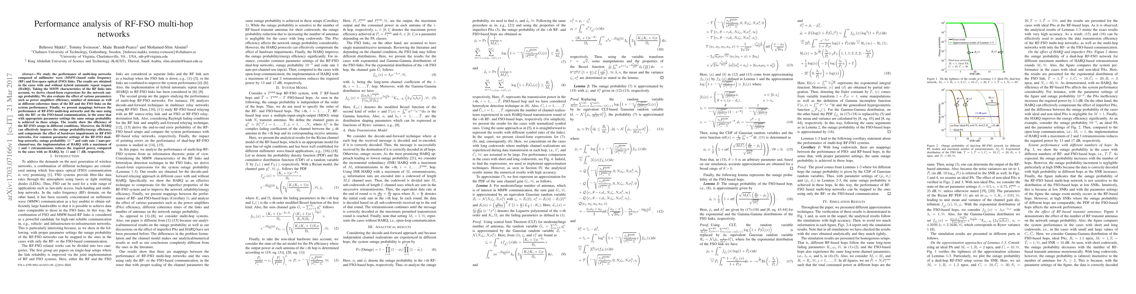 This paper analyzes the performance of multi-hop RF-FSO networks with MMW-based RF links and FSO links, deriving expressions for network outage probability and evaluating the impact of various system parameters. It demonstrates that hybrid automatic repeat request (HARQ) can significantly enhance outage probability and energy efficiency, reducing required power by 13-17 dB for dual-hop networks under specific conditions.