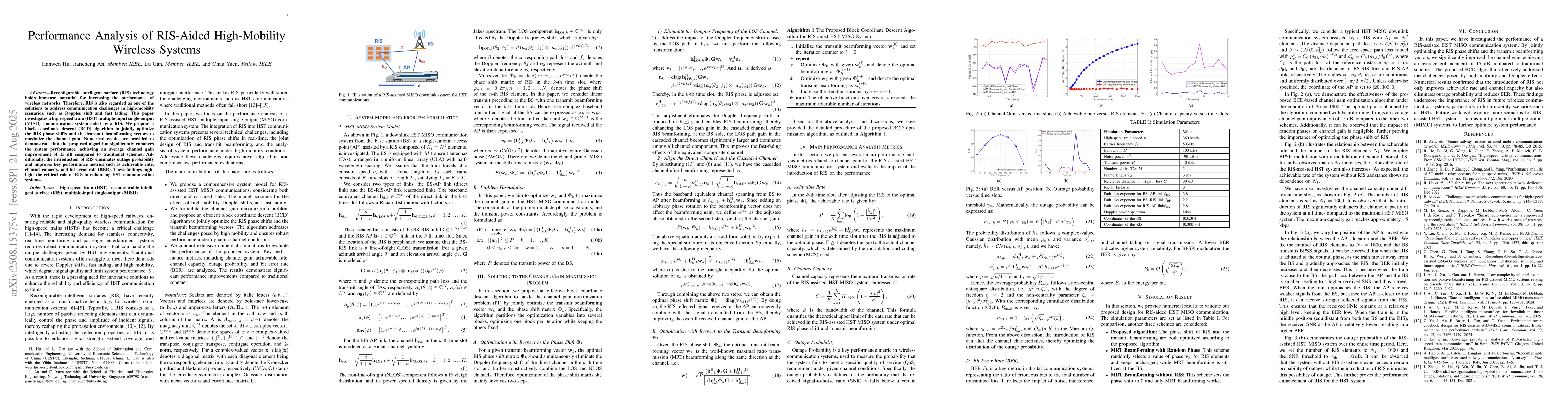 Reconfigurable intelligent surface (RIS) technology holds immense potential for increasing the performance of wireless networks. Therefore, RIS is also regarded as one of the solutions to address communication challenges in high-mobility scenarios, such as Doppler shift and fast fading. This paper investigates a high-speed train (HST) multiple-input single-output (MISO) communication system aided by a RIS. We propose a block coordinate descent (BCD) algorithm to jointly optimize the RIS phase shifts and the transmit beamforming vectors to maximize the channel gain. Numerical results are provided to demonstrate that the proposed algorithm significantly enhances the system performance, achieving an average channel gain improvement of 15 dB compared to traditional schemes. Additionally, the introduction of RIS eliminates outage probability and improves key performance metrics such as achievable rate, channel capacity, and bit error rate (BER). These findings highlight the critical role of RIS in enhancing HST communication systems.