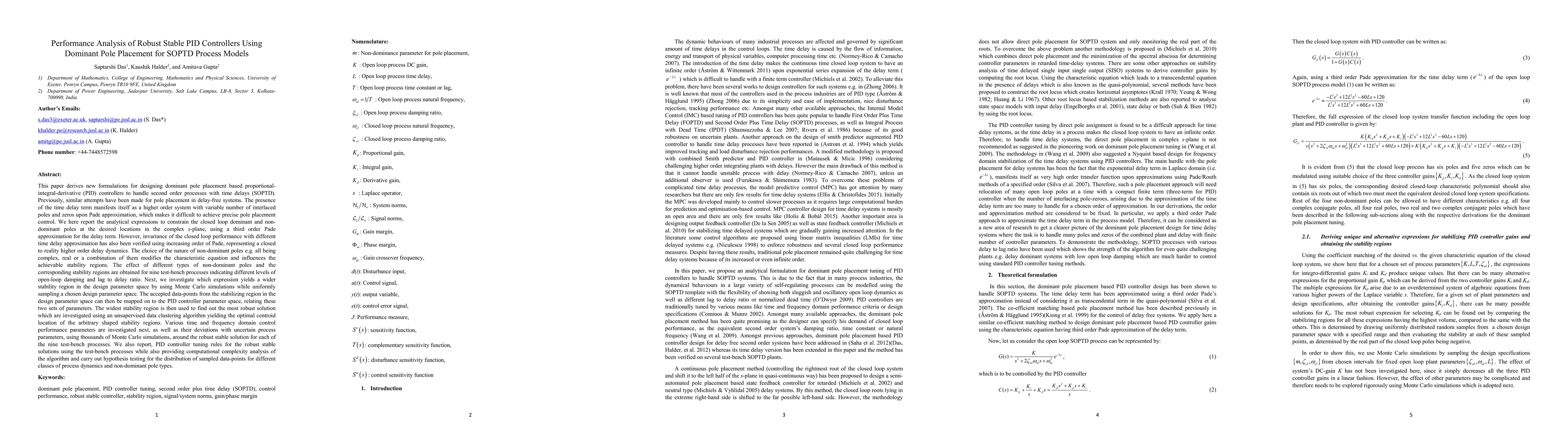 This paper develops new formulations for designing robust PID controllers using dominant pole placement for second order processes with time delays (SOPTD). The study investigates the effects of different types of non-dominant poles on stability regions and evaluates the performance of various control parameters through extensive Monte Carlo simulations.