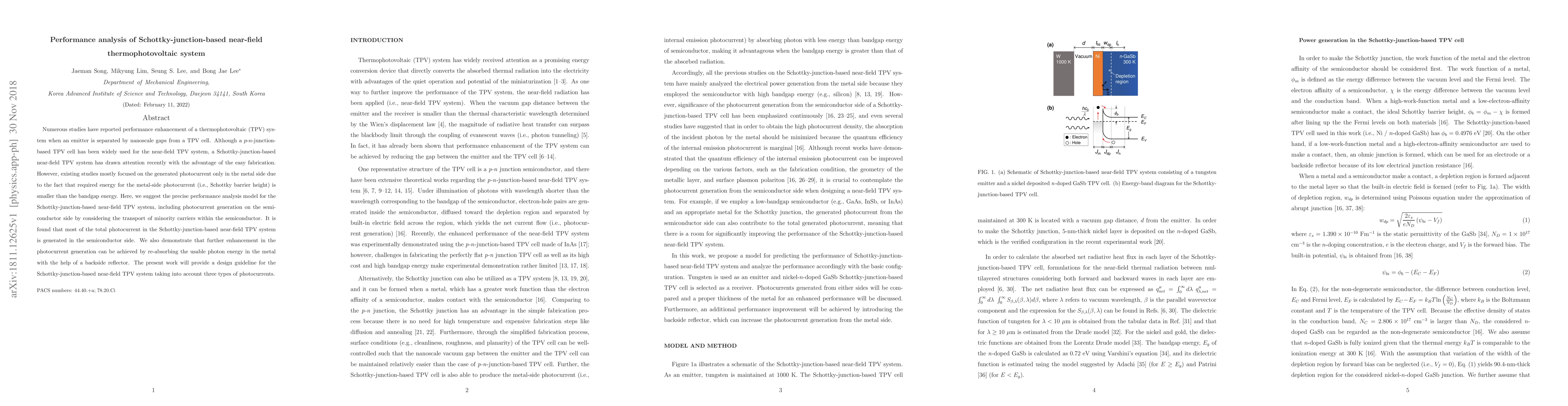 This paper presents a detailed performance analysis model for Schottky-junction-based near-field thermophotovoltaic systems, revealing that most photocurrent is generated in the semiconductor, not just the metal side. It also suggests enhancing photocurrent generation by re-absorbing usable photon energy in the metal using a backside reflector.