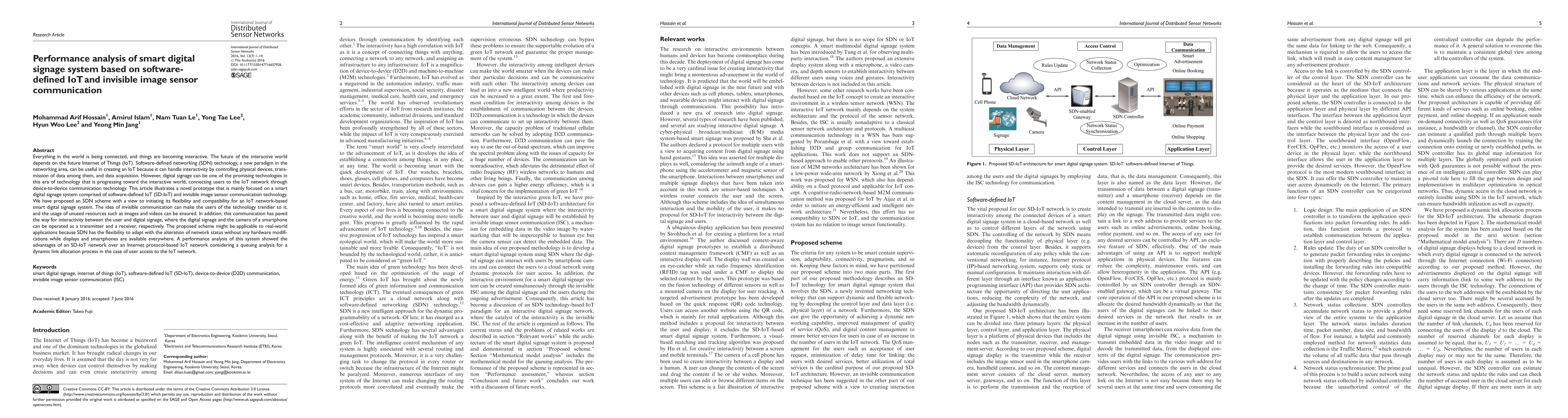 Everything in the world is being connected, and things are becoming interactive. The future of the interactive world depends on the future Internet of Things (IoT). Software-defined networking (SDN) technology, a new paradigm in the networking area, can be useful in creating an IoT because it can handle interactivity by controlling physical devices, transmission of data among them, and data acquisition. However, digital signage can be one of the promising technologies in this era of technology that is progressing toward the interactive world, connecting users to the IoT network through device-to-device communication technology. This article illustrates a novel prototype that is mainly focused on a smart digital signage system comprised of software-defined IoT (SD-IoT) and invisible image sensor communication technology. We have proposed an SDN scheme with a view to initiating its flexibility and compatibility for an IoT network-based smart digital signage system. The idea of invisible communication can make the users of the technology trendier to it, and the usage of unused resources such as images and videos can be ensured. In addition, this communication has paved the way for interactivity between the user and digital signage, where the digital signage and the camera of a smartphone can be operated as a transmitter and a receiver, respectively. The proposed scheme might be applicable to real-world applications because SDN has the flexibility to adapt with the alteration of network status without any hardware modifications while displays and smartphones are available everywhere. A performance analysis of this system showed the advantages of an SD-IoT network over an Internet protocol-based IoT network considering a queuing analysis for a dynamic link allocation process in the case of user access to the IoT network.