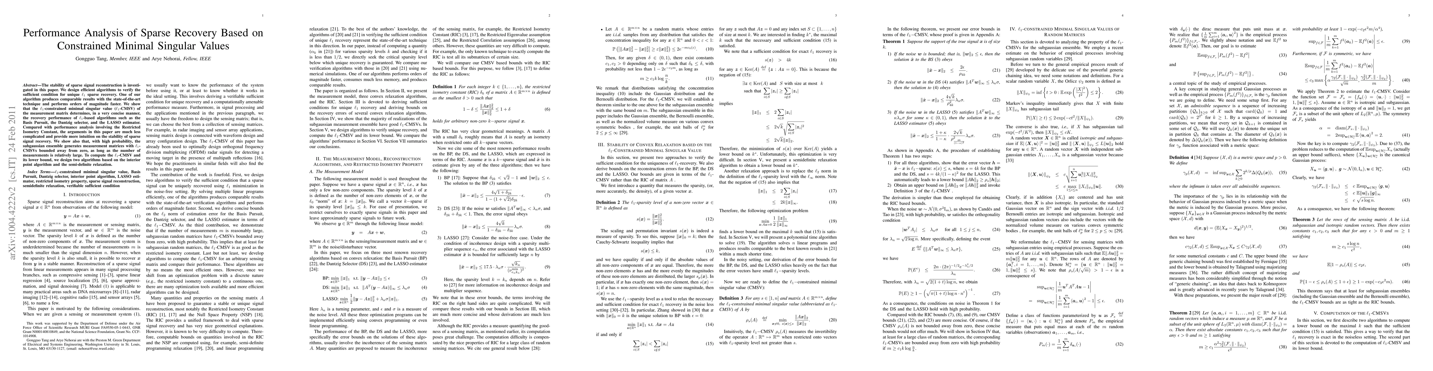 This paper investigates the stability of sparse signal reconstruction using efficient algorithms to verify the sufficient condition for unique $\ell_1$ sparse recovery. It introduces the $\ell_1$-constrained minimal singular value ($\ell_1$-CMSV) as a concise determinant of recovery performance for $\ell_1$-based algorithms, offering simpler and more intuitive analysis compared to the Restricted Isometry Constant.