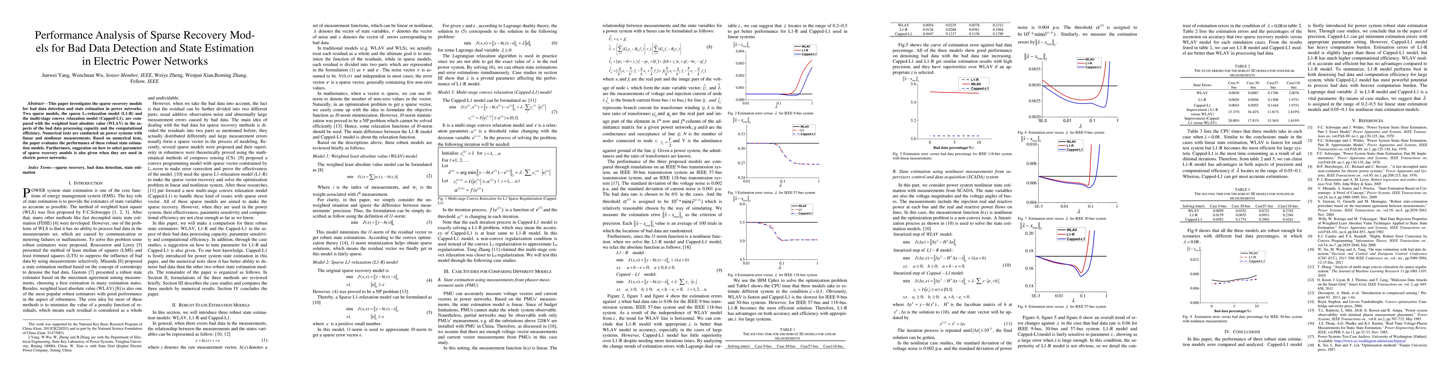 This paper compares sparse recovery models, specifically the sparse L1-relaxation model and the multi-stage convex relaxation model, against the weighted least absolute value method for bad data detection and state estimation in power networks. The study evaluates their performance in terms of bad data processing capacity and computational efficiency through numerical tests on both linear and nonlinear power systems.