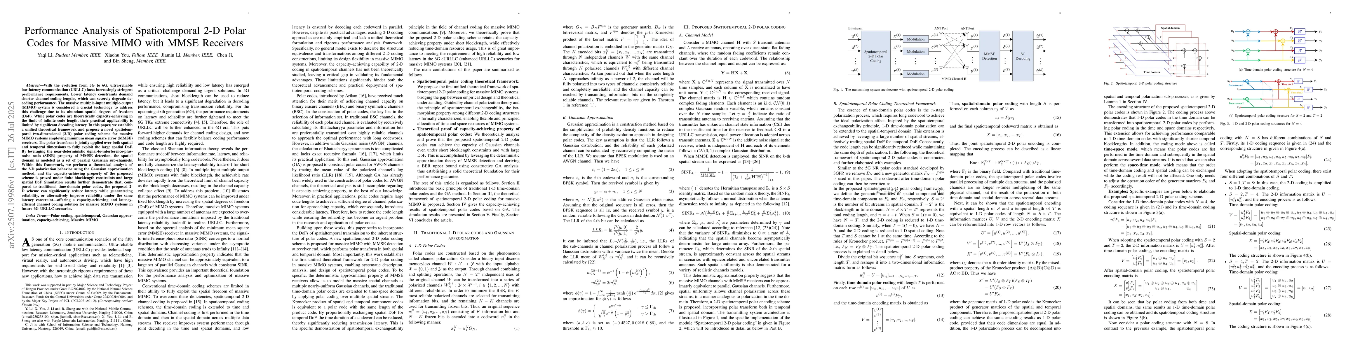 With the evolution from 5G to 6G, ultra-reliable low-latency communication (URLLC) faces increasingly stringent performance requirements. Lower latency constraints demand shorter channel coding lengths, which can severely degrade decoding performance. The massive multiple-input multiple-output (MIMO) system is considered a crucial technology to address this challenge due to its abundant spatial degrees of freedom (DoF). While polar codes are theoretically capacity-achieving in the limit of infinite code length, their practical applicability is limited by significant decoding latency. In this paper, we establish a unified theoretical framework and propose a novel spatiotemporal two-dimensional (2-D) polar coding scheme for massive MIMO systems employing minimum mean square error (MMSE) receivers. The polar transform is jointly applied over both spatial and temporal dimensions to fully exploit the large spatial DoF. By leveraging the near-deterministic signal-to-interference-plus-noise ratio (SINR) property of MMSE detection, the spatial domain is modeled as a set of parallel Gaussian sub-channels. Within this framework, we perform a theoretical analysis of the 2-D polarization behavior using the Gaussian approximation method, and the capacity-achieving property of the proposed scheme is proved under finite blocklength constraints and large spatial DoF. Simulation results further demonstrate that, compared to traditional time-domain polar codes, the proposed 2-D scheme can significantly reduce latency while guaranteeing reliability, or alternatively improve reliability under the same latency constraint -- offering a capacity-achieving and latency-efficient channel coding solution for massive MIMO systems in future 6G URLLC scenarios.