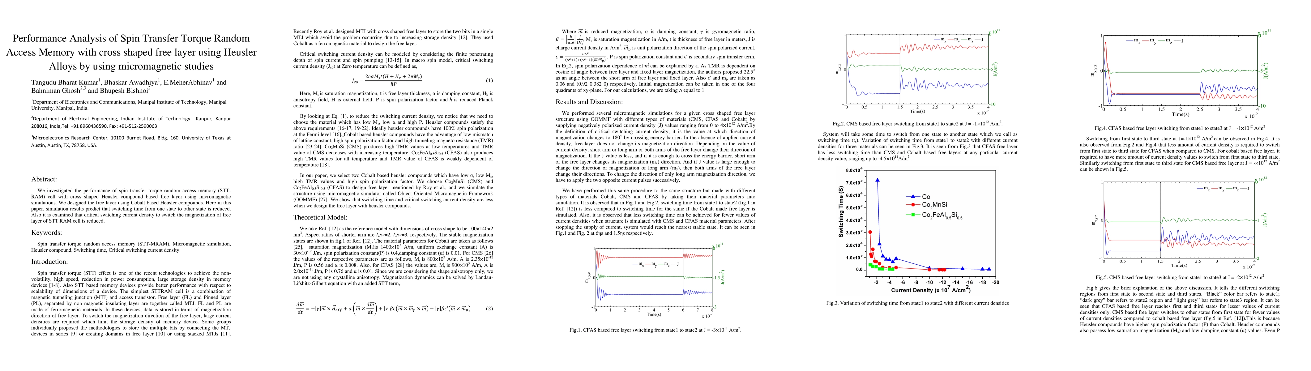 This research investigates the performance of a spin transfer torque random access memory (STT-RAM) with a cross-shaped free layer made of Cobalt-based Heusler compounds using micromagnetic simulations. The study finds that switching time and critical switching current density are both reduced, enhancing the efficiency of the memory cell.