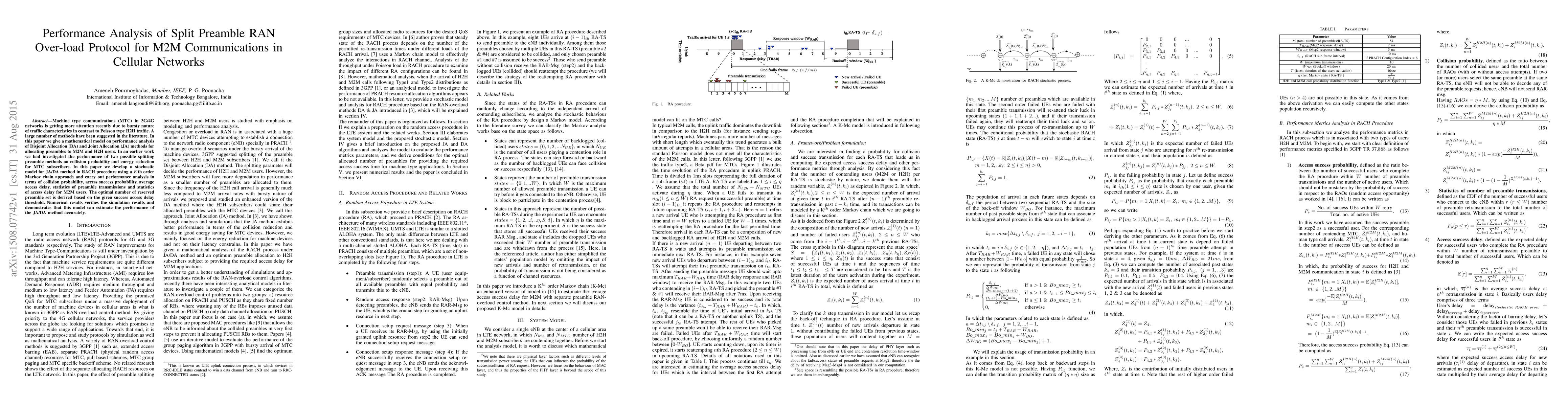 Machine type communications (MTC) in 3G/4G networks is getting more attention recently due to bursty nature of traffic characteristics in contrast to Poisson type H2H traffic. A large number of methods have been suggested in the literature. In this paper we give a mathematical model on performance analysis of Disjoint Allocation (DA) and Joint Allocation (JA) methods for allocating preambles to M2M and H2H users. In an earlier work we had investigated the performance of two possible splitting preamble methods on collision probability and energy reduction for MTC subscribers. In this paper we develop a stochastic model for JA/DA method in RACH procedure using a $K$th order Markov chain approach and carry out performance analysis in terms of collision probability, access success probability, average access delay, statistics of preamble transmissions and statistics of access delay for M2M users. The optimal number of reserved preamble set is derived based on the given success access delay threshold. Numerical results verifies the simulation results and demonstrates that this model can estimate the performance of the JA/DA method accurately.