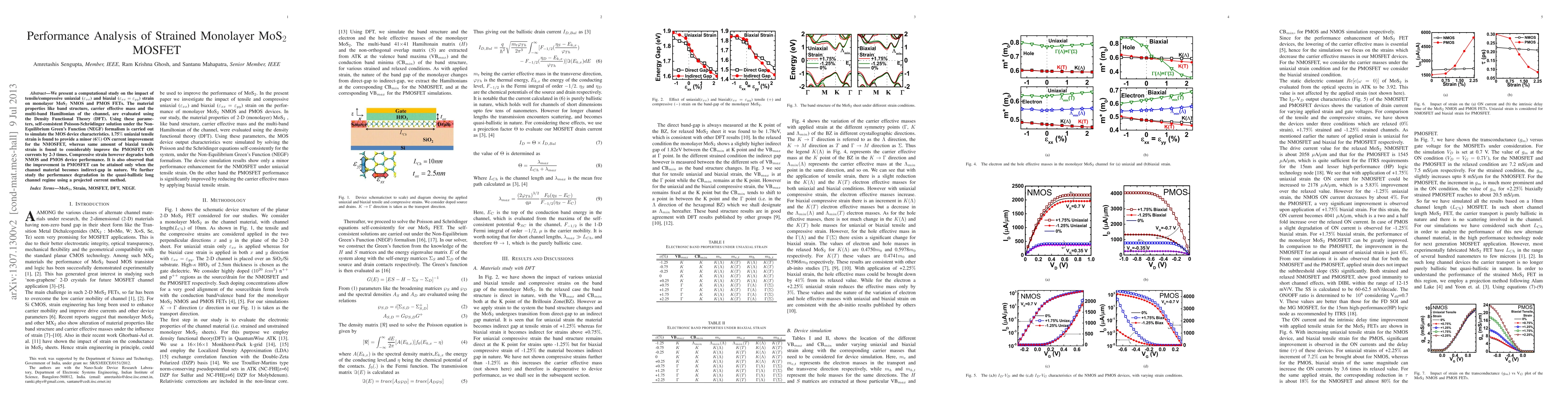 We present a computational study on the impact of tensile/compressive uniaxial ($\varepsilon_{xx}$) and biaxial ($\varepsilon_{xx}=\varepsilon_{yy}$) strain on monolayer MoS$_{2}$ NMOS and PMOS FETs. The material properties like band structure, carrier effective mass and the multi-band Hamiltonian of the channel, are evaluated using the Density Functional Theory (DFT). Using these parameters, self-consistent Poisson-Schr\"{o}dinger solution under the Non-Equilibrium Green's Function (NEGF) formalism is carried out to simulate the MOS device characteristics. 1.75$%$ uniaxial tensile strain is found to provide a minor (6$%$) ON current improvement for the NMOSFET, whereas same amount of biaxial tensile strain is found to considerably improve the PMOSFET ON currents by 2-3 times. Compressive strain however degrades both NMOS and PMOS device performance. It is also observed that the improvement in PMOSFET can be attained only when the channel material becomes indirect-gap in nature. We further study the performance degradation in the quasi-ballistic long channel regime using a projected current method.