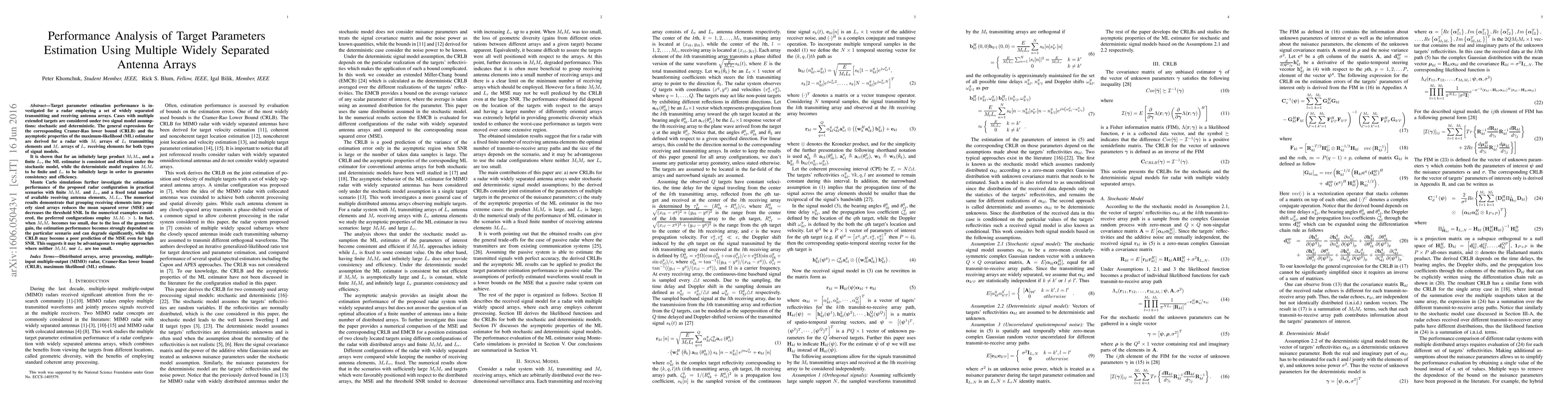 The research investigates target parameter estimation performance using multiple widely separated antenna arrays under stochastic and deterministic signal models. It derives general expressions for the Cramer-Rao Lower Bound (CRLB) and examines the asymptotic properties of the Maximum Likelihood (ML) estimator for a radar with $M_t$ transmitting arrays of $L_t$ elements and $M_r$ receiving arrays of $L_r$ elements.