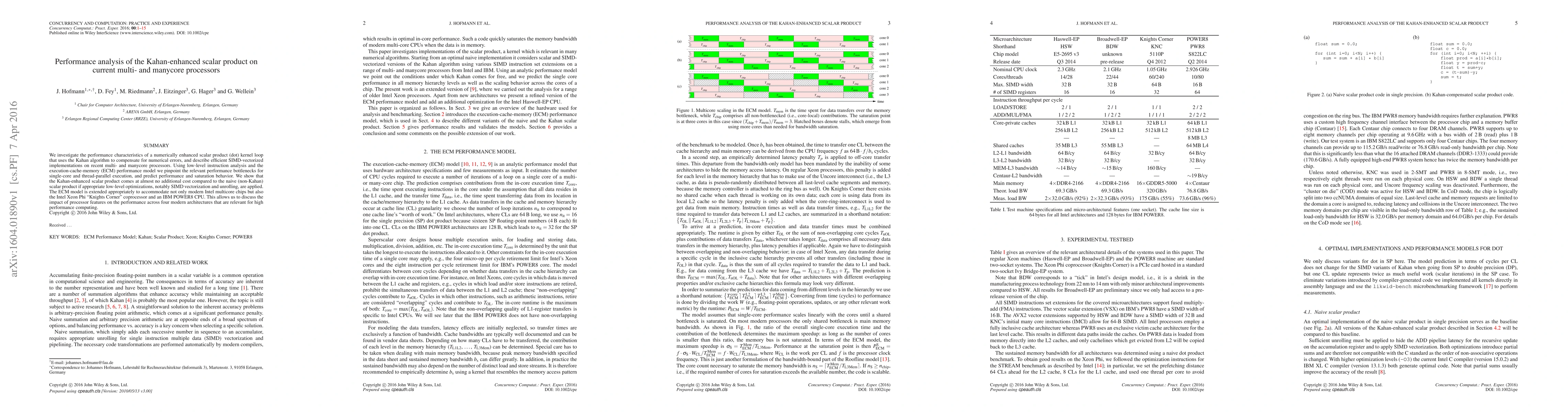 We investigate the performance characteristics of a numerically enhanced scalar product (dot) kernel loop that uses the Kahan algorithm to compensate for numerical errors, and describe efficient SIMD-vectorized implementations on recent multi- and manycore processors. Using low-level instruction analysis and the execution-cache-memory (ECM) performance model we pinpoint the relevant performance bottlenecks for single-core and thread-parallel execution, and predict performance and saturation behavior. We show that the Kahan-enhanced scalar product comes at almost no additional cost compared to the naive (non-Kahan) scalar product if appropriate low-level optimizations, notably SIMD vectorization and unrolling, are applied. The ECM model is extended appropriately to accommodate not only modern Intel multicore chips but also the Intel Xeon Phi "Knights Corner" coprocessor and an IBM POWER8 CPU. This allows us to discuss the impact of processor features on the performance across four modern architectures that are relevant for high performance computing.