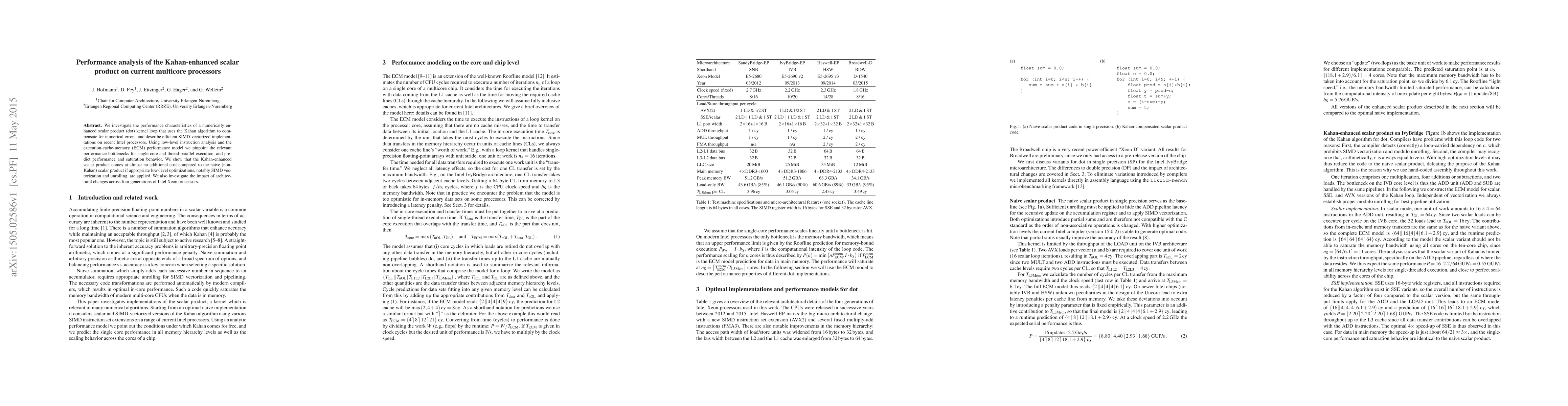 We investigate the performance characteristics of a numerically enhanced scalar product (dot) kernel loop that uses the Kahan algorithm to compensate for numerical errors, and describe efficient SIMD-vectorized implementations on recent Intel processors. Using low-level instruction analysis and the execution-cache-memory (ECM) performance model we pinpoint the relevant performance bottlenecks for single-core and thread-parallel execution, and predict performance and saturation behavior. We show that the Kahan-enhanced scalar product comes at almost no additional cost compared to the naive (non-Kahan) scalar product if appropriate low-level optimizations, notably SIMD vectorization and unrolling, are applied. We also investigate the impact of architectural changes across four generations of Intel Xeon processors.