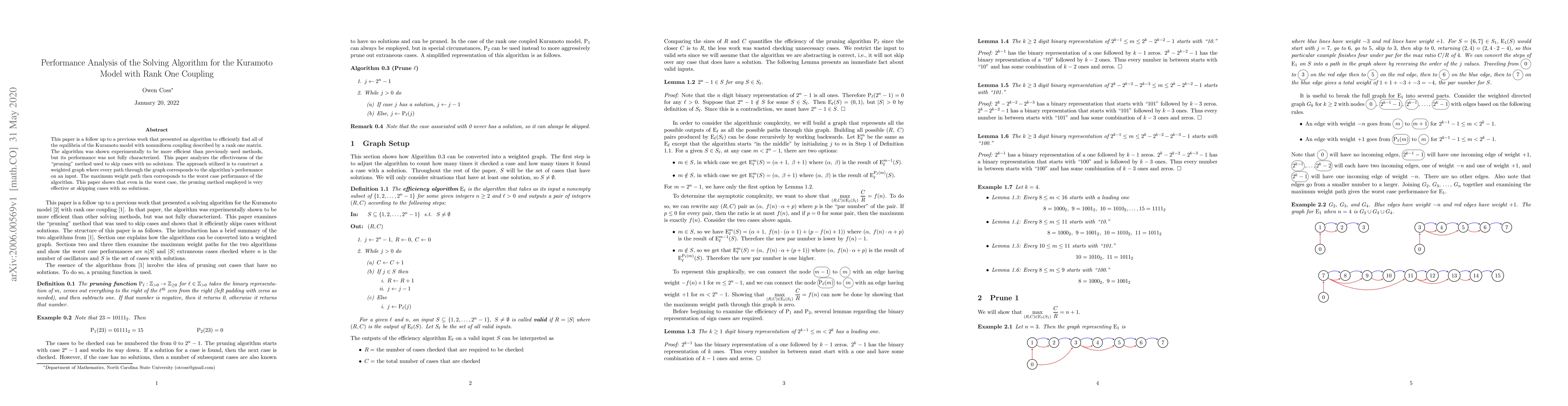 This paper is a follow up to a previous work that presented an algorithm to efficiently find all of the equilibria of the Kuramoto model with nonuniform coupling described by a rank one matrix. The algorithm was shown experimentally to be more efficient than previously used methods, but its performance was not fully characterized. This paper analyzes the effectiveness of the "pruning" method used to skip cases with no solutions. The approach utilized is to construct a weighted graph where every path through the graph corresponds to the algorithm's performance on an input. The maximum weight path then corresponds to the worst case performance of the algorithm. This paper shows that even in the worst case, the pruning method employed is very effective at skipping cases with no solutions.