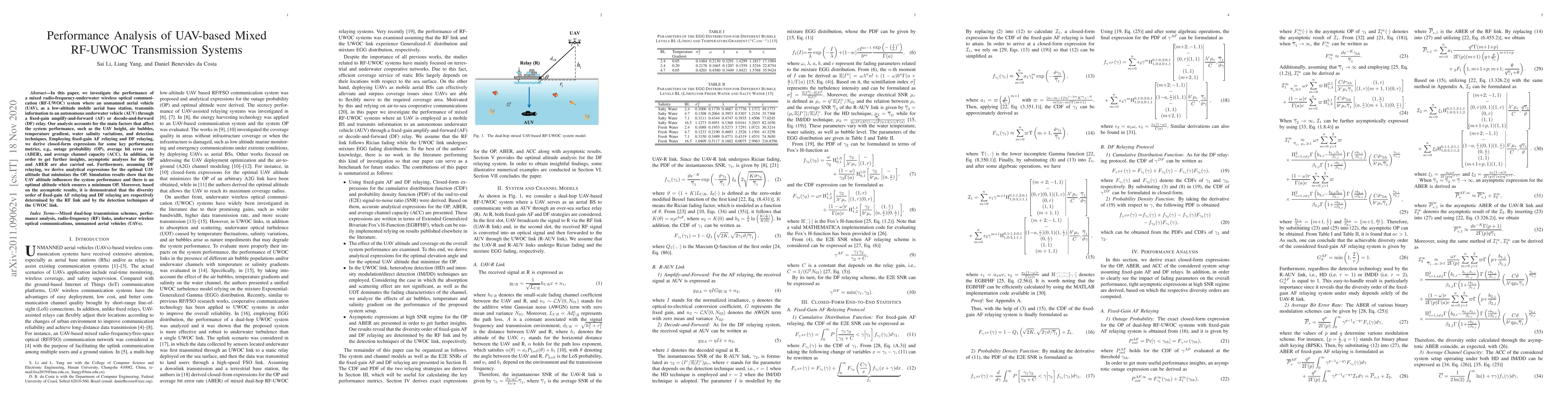 This paper analyzes the performance of a mixed RF-UWOC system using UAVs as mobile aerial base stations to relay information to AUVs. It derives closed-form expressions for key metrics like outage probability, ABER, and channel capacity, and finds an optimal UAV altitude that minimizes outage probability.
