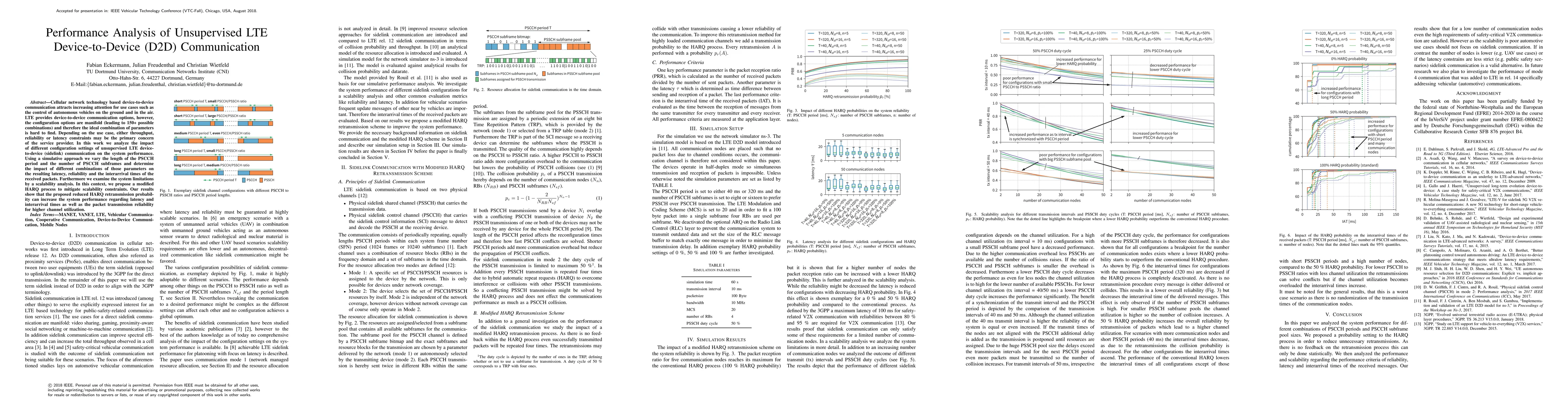 This paper analyzes the performance of unsupervised LTE Device-to-Device (D2D) communication under various configurations, focusing on latency, reliability, and scalability. The study proposes a modified HARQ process to enhance performance, demonstrating improved results in packet transmission reliability and reduced latency for higher channel utilization.
